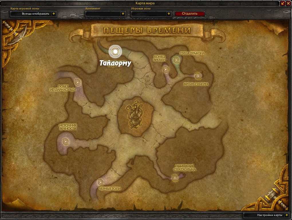 Глаза прикольно анимированы, они мерцают огнём, а при прыжке у персонажа появляются крылья, как у летучей мыши. Все части комплекта, кроме ботинок, обмениваются на токены в Пещерах времени в Танарисе у НПЦ по имени Тайдорму. Сам этот НПЦ находится внутри инста Битва за гору Хиджал. Нужно зайти в портал, обозначенный на карте ниже, и Ваш персонаж попадёт в пещеру. Именно в этой пещере и находится Тайдорму.