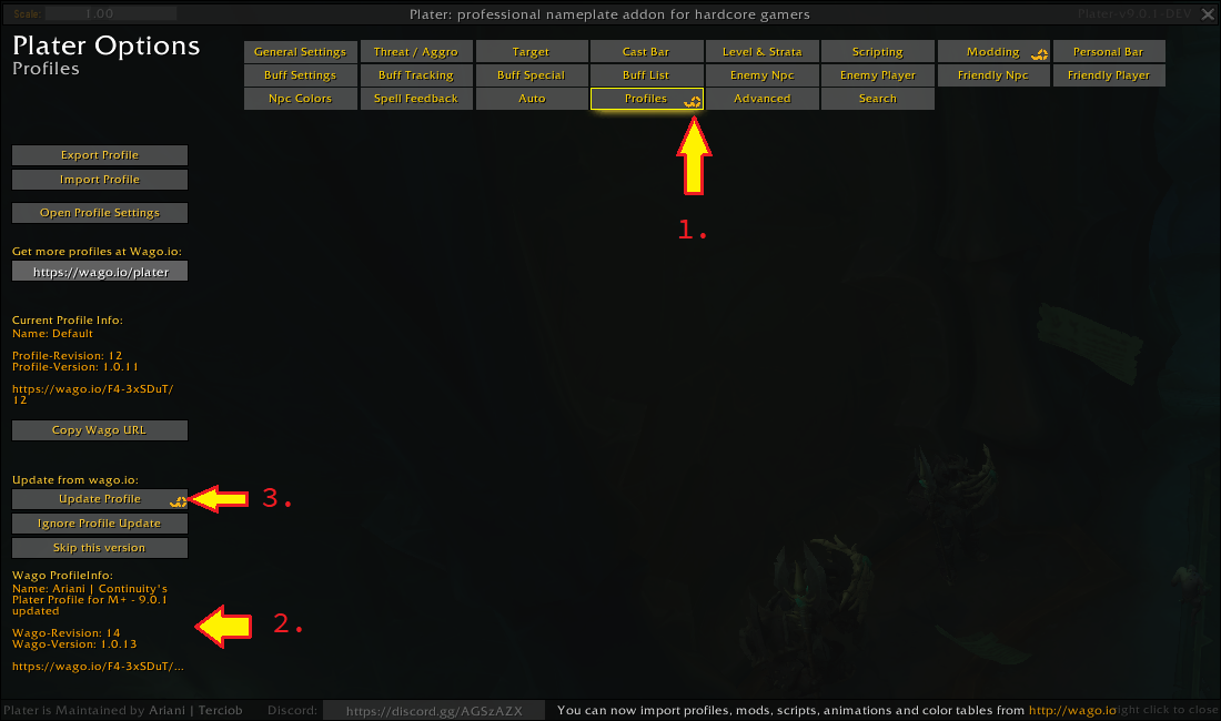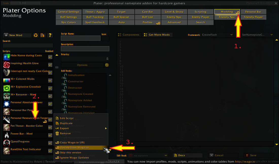 - Now open the Plater options panel in-game and look for the wago icons on the Scripting, Modding or Profiles tab. Those icons indicate available updates in this category, as can be seen on (1.) on the screenshots below.