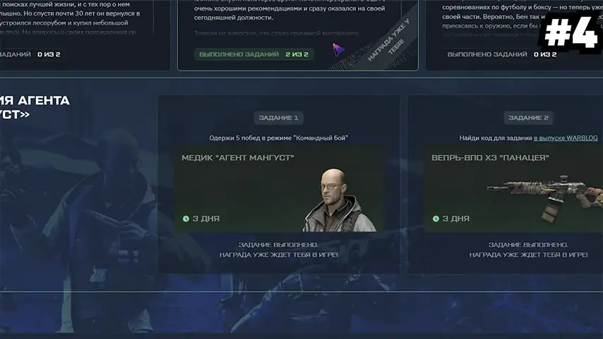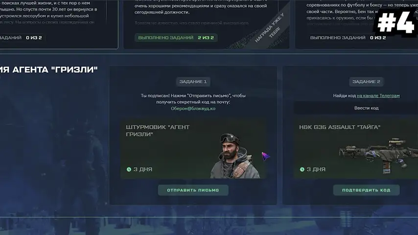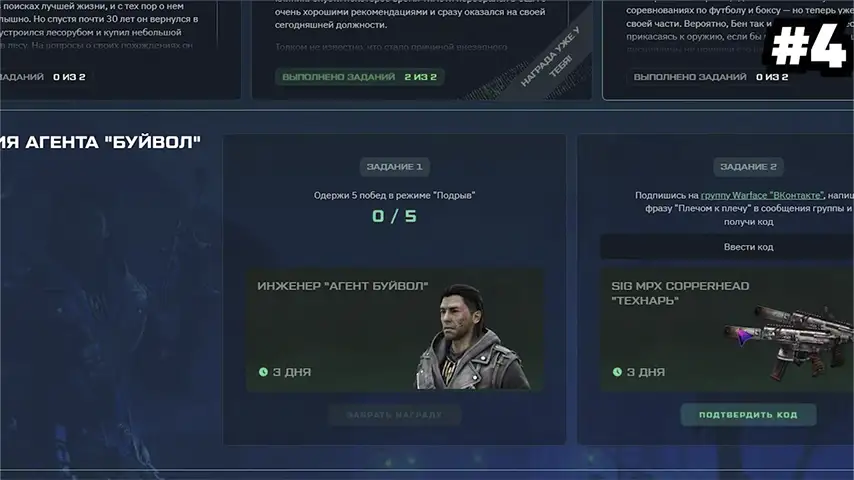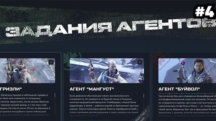 В самом низу будут досье агентов в каждом из которых есть несколько квестов как социальных для получения кода так и игровые выполнив всю эту историю ты получаешь все возможные внешности на время и метовые донатные пушки.