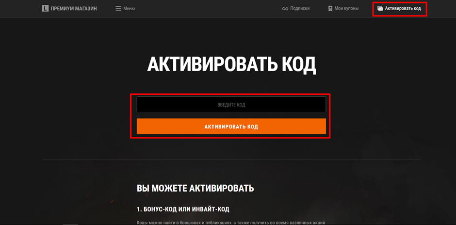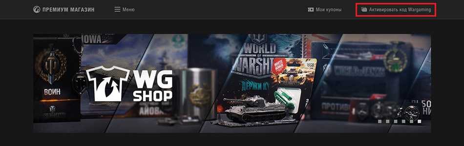 Перейдите на сайт Премиум магазина и кликните по кнопке «Активировать код Wargaming»