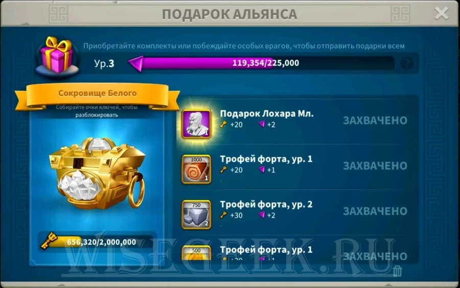 В-пятых, когда участники альянса приобретают комплект, уничтожают форт варваров или побеждают Лохара, все участники получают подарок альянса. Подарки альянса содержат различные предметы, подарочные очки и ключевые очки. Подарочные очки позволяют повысить уровень подарка альянса, а ключевые очки открывают кристальные сокровища.