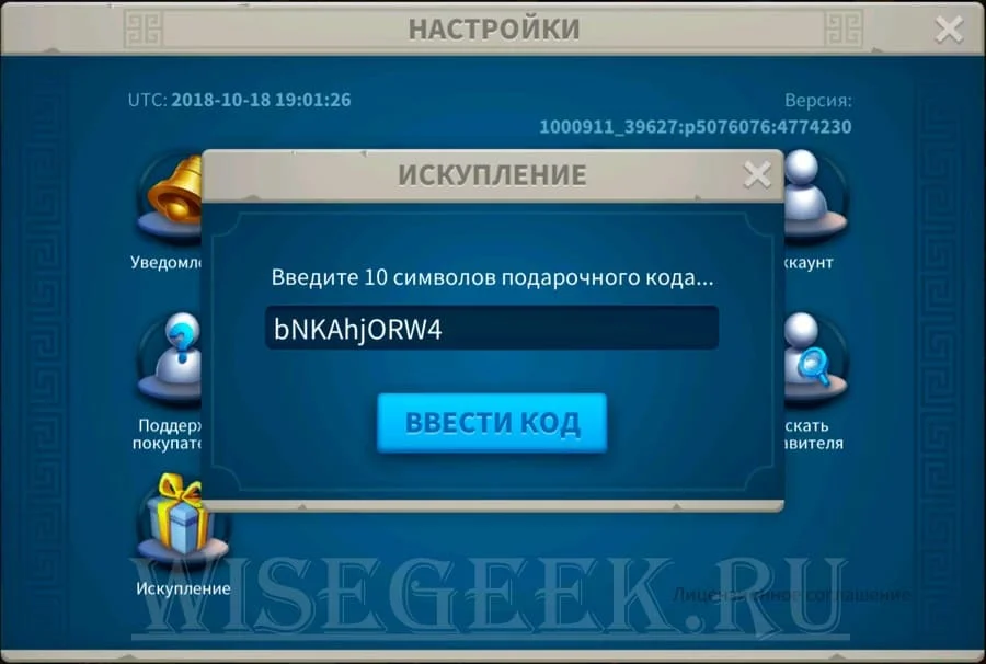 Чтобы ввести подарочный код нужно нажать на иконку персонажа сверху слева. Затем перейти в настройки и щелкнуть по иконке «Искупление» (перевод у игры ужасный). В появившемся окошке вводите требуемый код.
