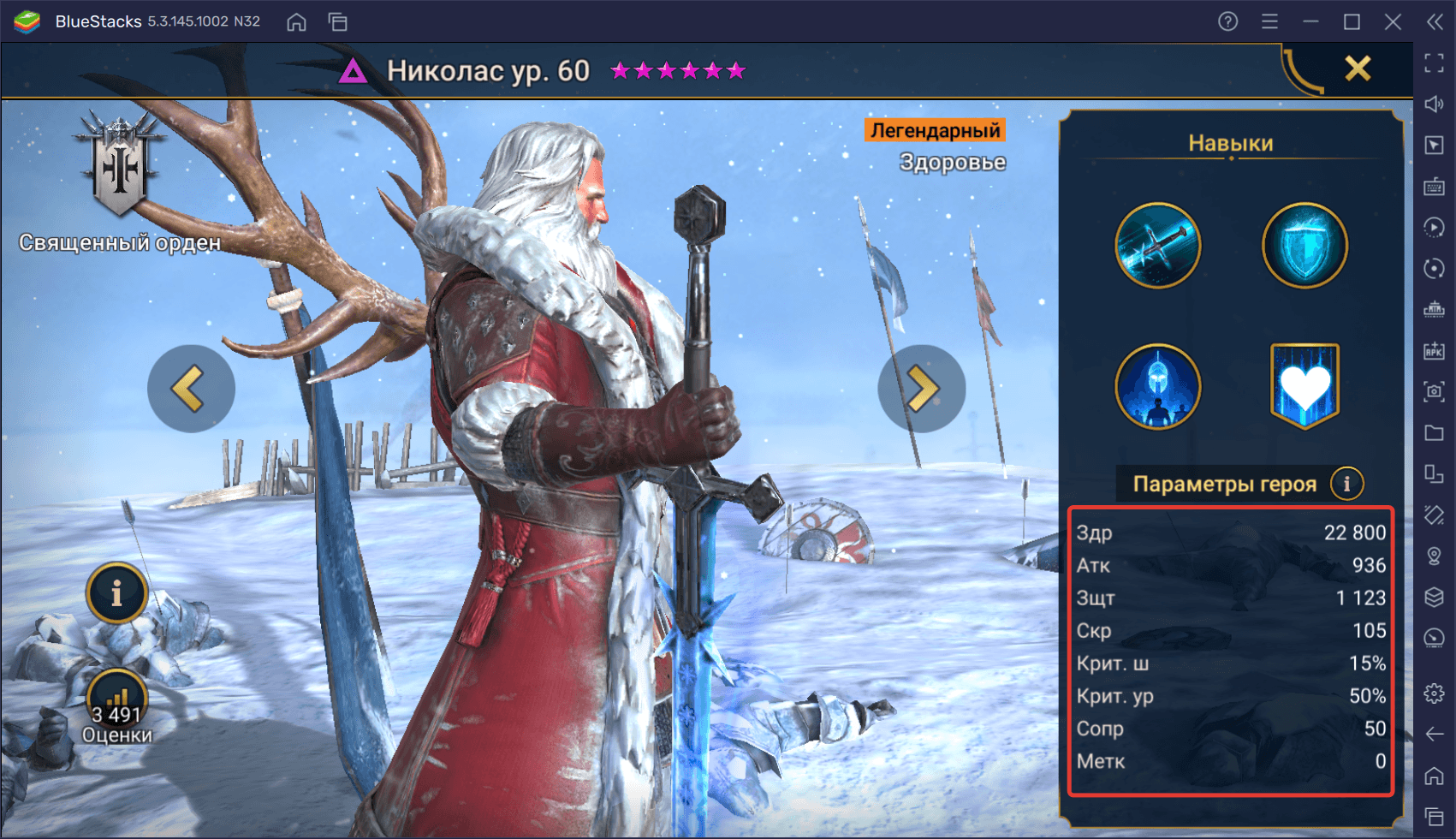 Николас отличается очень высоким показателем здоровья, что позволяет ему выдерживать больше урона. Но еще урон от его умений увеличивается в зависимости от величины максимального здоровья. И это позволяет создавать интересные комбинации снаряжения, недоступные героям защиты или атаки. Вторая сильная сторона персонажа — высокая скорость в 105, что позволяет поднять ее на более высокий уровень, по сравнению с медленными героями. Приоритетные характеристики героя: скорость, здоровье, меткость, защита, атака.
