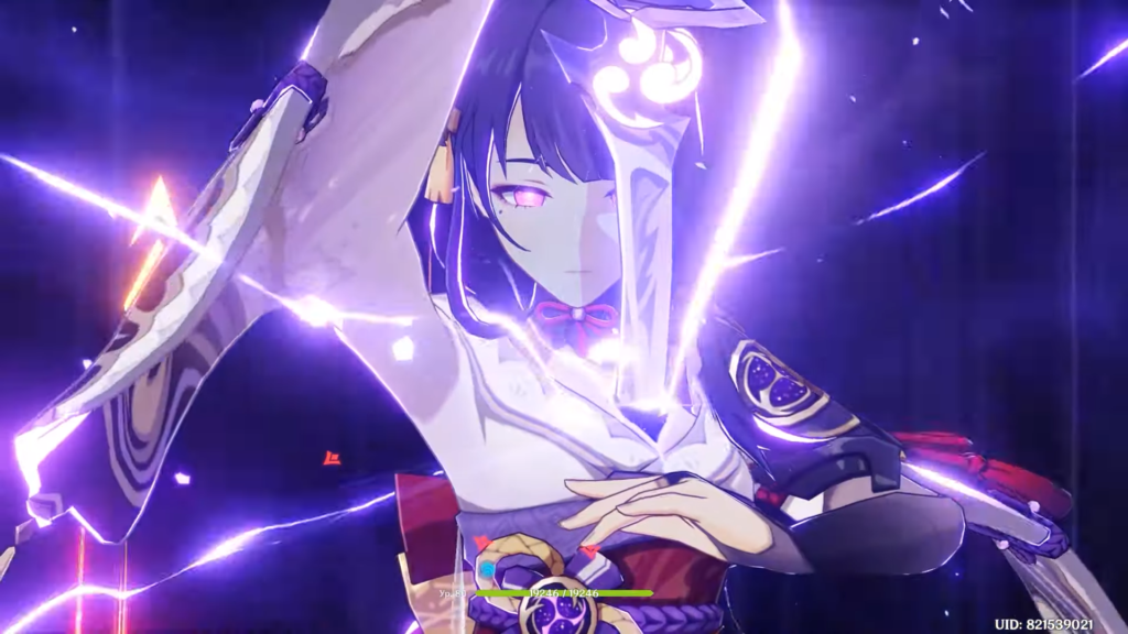 Подобно Тарталье, сёгун Райдэн может менять своё оружие, но только на время действия взрыва стихий. После его активации она призывает одноручный меч, которым наносит большое количество урона.