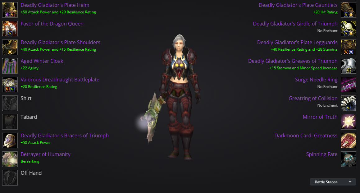 Helm: Deadly Gladiator’s Plate HelmNeck: Favor of the Dragon QueenShoulders: Deadly Gladiator’s Plate ShouldersBack: Aged Winter CloakChest: Valorous Dreadnaught BattleplateBracers: Deadly Gladiator’s Bracers of TriumphGloves: Deadly Gladiator’s Plate GauntletsBelt: Deadly Gladiator’s Girdle of TriumphLegs: Deadly Gladiator’s Plate LegguardsBoots: Deadly Gladiator’s Greaves of TriumphRing 1: Surge Needle RingRing 2: Greatring of CollisionTrinket 1: Mirror of TruthTrinket 2: Darkmoon Card: GreatnessWeapon: Betrayer of HumanityRanged: Spinning Fate