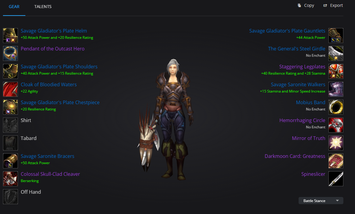 Helm: Savage Gladiator’s Plate HelmNeck: Pendant of the Outcast HeroShoulders: Savage Gladiator’s Plate ShouldersBack: Cloak of Bloodied WatersChest: Savage Gladiator’s Plate ChestpieceBracers: Savage Saronite BracersGloves: Savage Gladiator’s Plate GauntletsBelt: The General’s Steel GirdleLegs: Staggering LegplatesBoots: Savage Saronite WalkersRing 1: Mobius BandRing 2: Hemorrhaging CircleTrinket 1: Mirror of TruthTrinket 2: Darkmoon Card: GreatnessWeapon: Colossal Skull-Clad CleaverRanged: Spineslicer