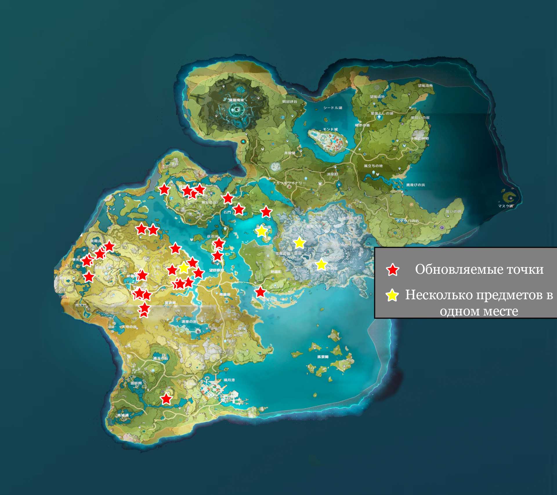 На изображении ниже отмечены точки спавна объектов в Ли Юэ, из которых можно получить низкокачественные артефакты. Этот маршрут на сегодняшний день является самым удобным для ежедневного фарма артефактов.