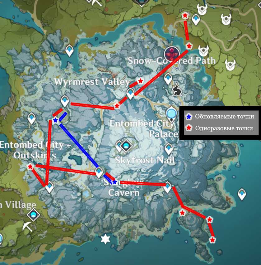 На изображении ниже показан лучший маршрут для фарма артефактов в Драконьем хребте. Синие звездочки указывают на то, что артефакт нужно искать под землей. Время респавна лута в этой и других локациях – 24 часа (1 реальные сутки).