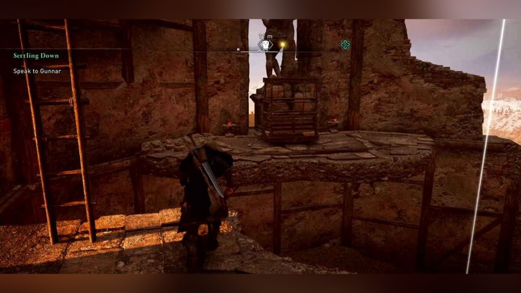 Вам нужно расчистить проход в руинах. Для этого поднимайтесь на верхнюю платформу, берите взрывающуюся бочку и возвращайтесь обратно по веревке. Около самого завала поверните налево и прыгайте на столб. Оттуда можно бросить бочку на заваленный проход. Если не получилось — возвращайтесь и пробуйте снова. Затем спускайтесь и забирайте артефакт, который лежит на столе.