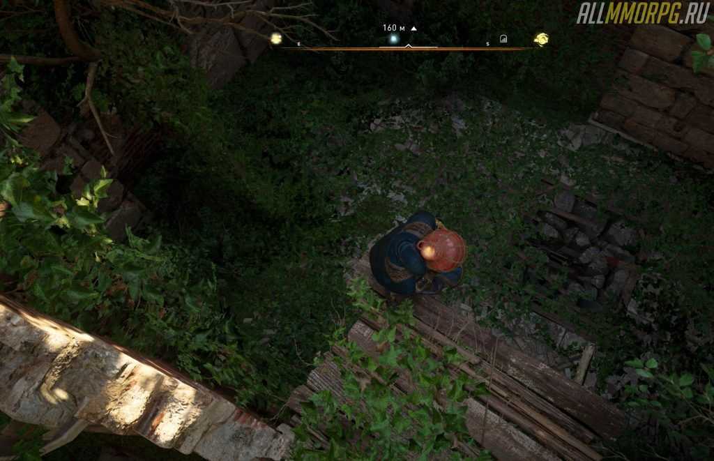 Аккуратно перейдите по доске на полуразрушенную стену и взломайте люк на полу при помощи стрелы. Как это сделать? Выстрелите из лука в кувшин с легковоспламеняющимся содержимым. Найти кувшины можно в поселении неподалеку. Большая часть из них лежит в синей палатке (показано на скриншоте).