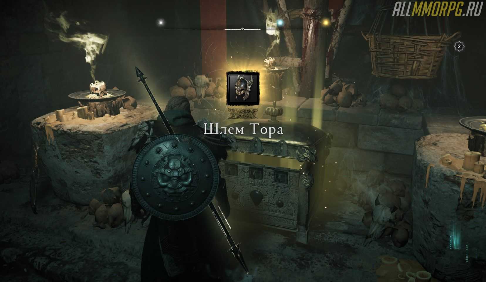 После статуя разрушится, а под ней откроется проход. Спускайтесь вниз. У алтаря в конце коридора вы найдете сундук со шлемом Тора.