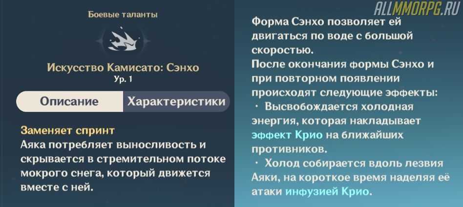 «Искусство Камисато: Сэнхо» – альтернативное умение, которое дает возможность герою быстро передвигаться в бою, избегать атак противников и накладывать на них эффект Крио. При этом сама способность не наносит урон, но потребляет небольшое количество выносливости.