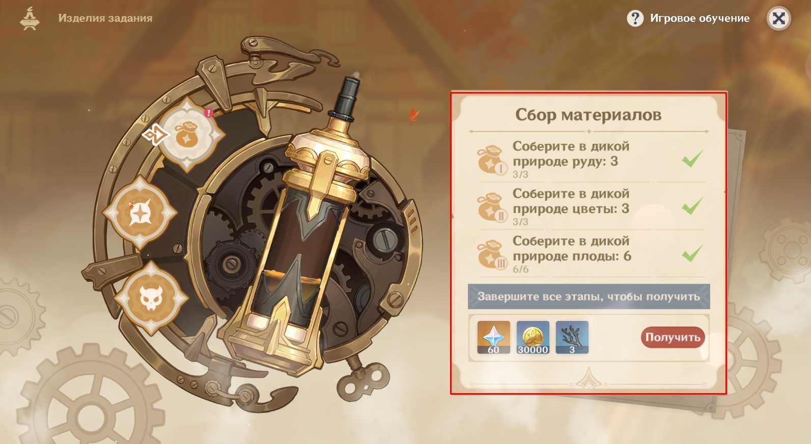 С этого момента на баннере события становится доступной кнопка «Изделия задания». Нажмите на нее, чтобы открыть интерфейс «Коллектора материалов» и забрать награду за первое выполненное поручение Бертрана – 60 Камней Истока, 30 тыс. моры и 3 Драгоценных ветви внешних морей.