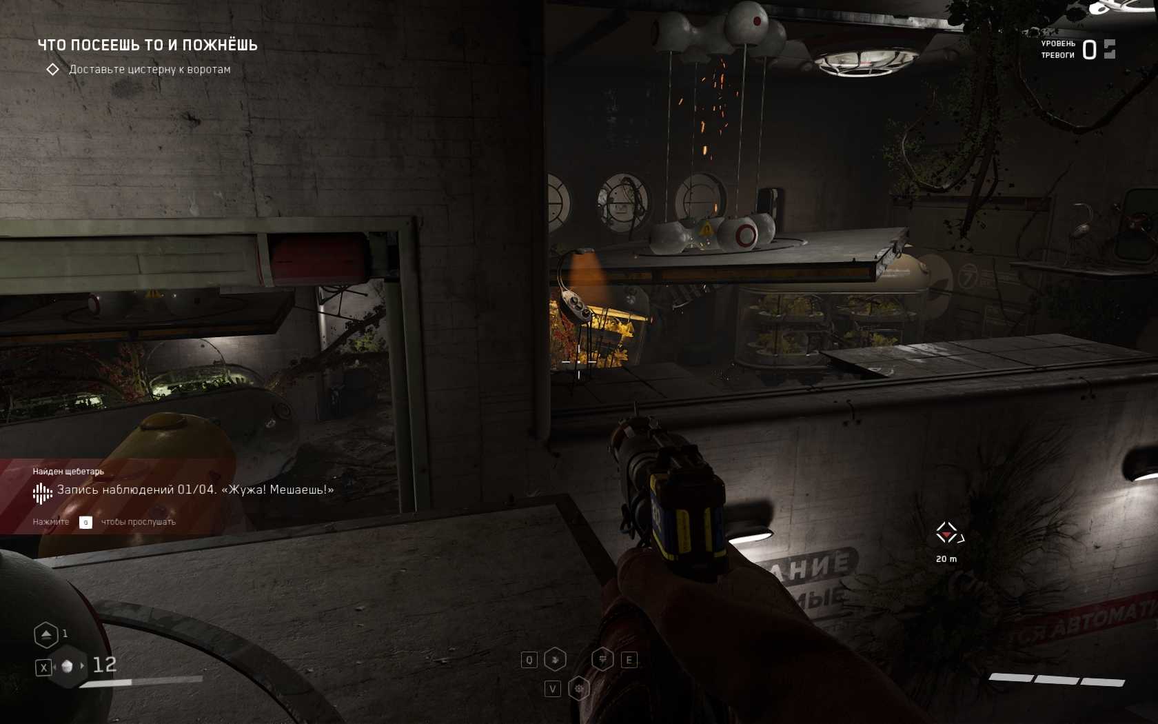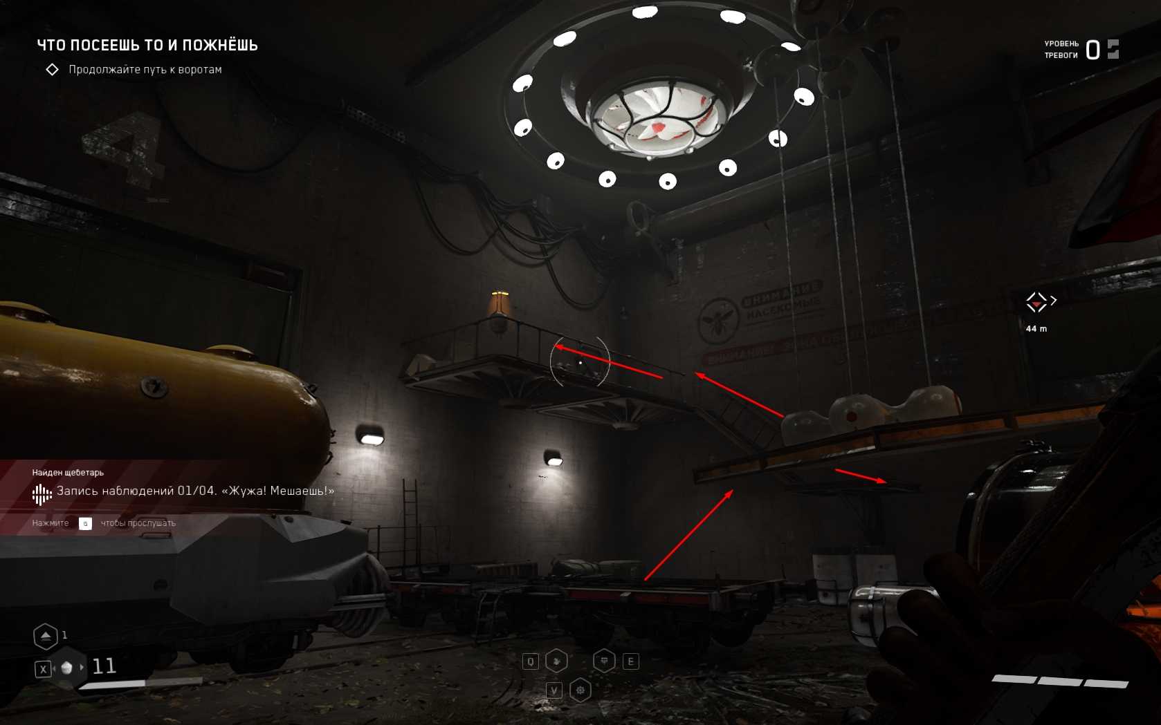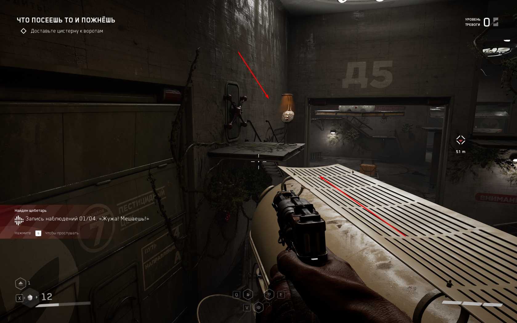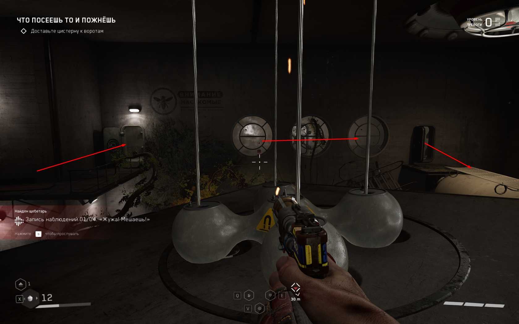 Двигайтесь по коридору до цеховой лаборатории. Возле одной из огромных ванн с красной жижей лежит «Щебетарь №71». Вам нужно добраться до ворот, на которые указывает квестовый маркер. Как только вы приблизитесь к ним, запустится видео-ролик. В нем нам покажут процесс передачи головы Петрова Штокхаузену и Ларису Филатову. После взрыва гранаты у главного героя снова начнутся видения.