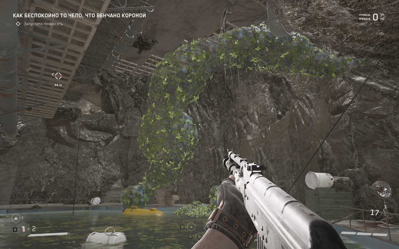 Расправившись с «Росой», используйте выступы на скалах, чтобы забраться наверх. Когда вы окажетесь на краю скалы, запустится кат-сцена. ХРАЗ уговорит Нечаева выбросить коробочку с кольцами, которые ему отдал Петров в театре. После кат-сцены пройдите через туннель и откройте дверь. За ней вас встретит множество «Сипух», но они не будут атаковать, поскольку Сеченову удалось отключить боевой режим роботов с помощью головы Петрова.