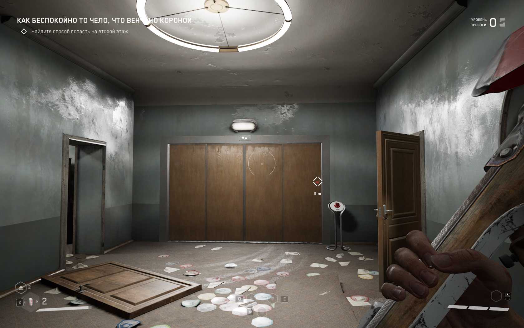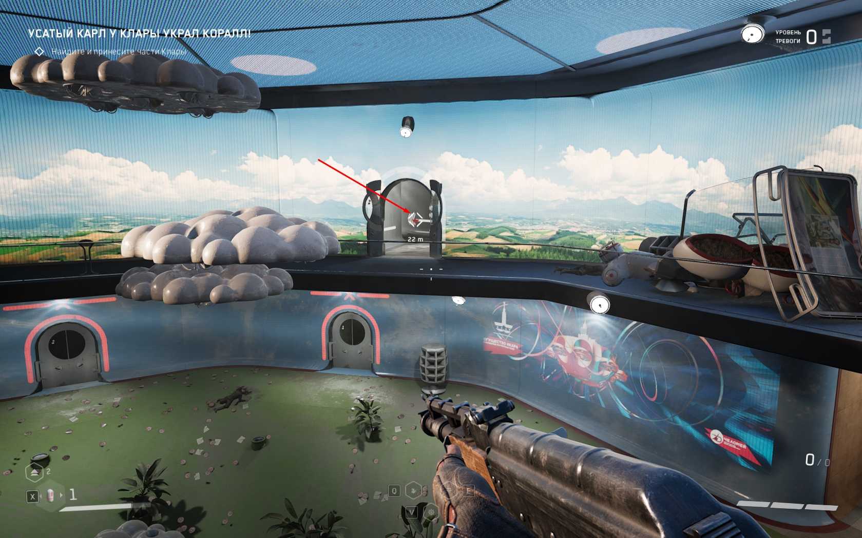 Откройте дверь и сядьте в лифт, который находится рядом со входом в безопасную комнату, вызвав его с помощью красной кнопки. Не забудьте подобрать «Щебетарь №67» с кушетки рядом с безопасной комнатой.