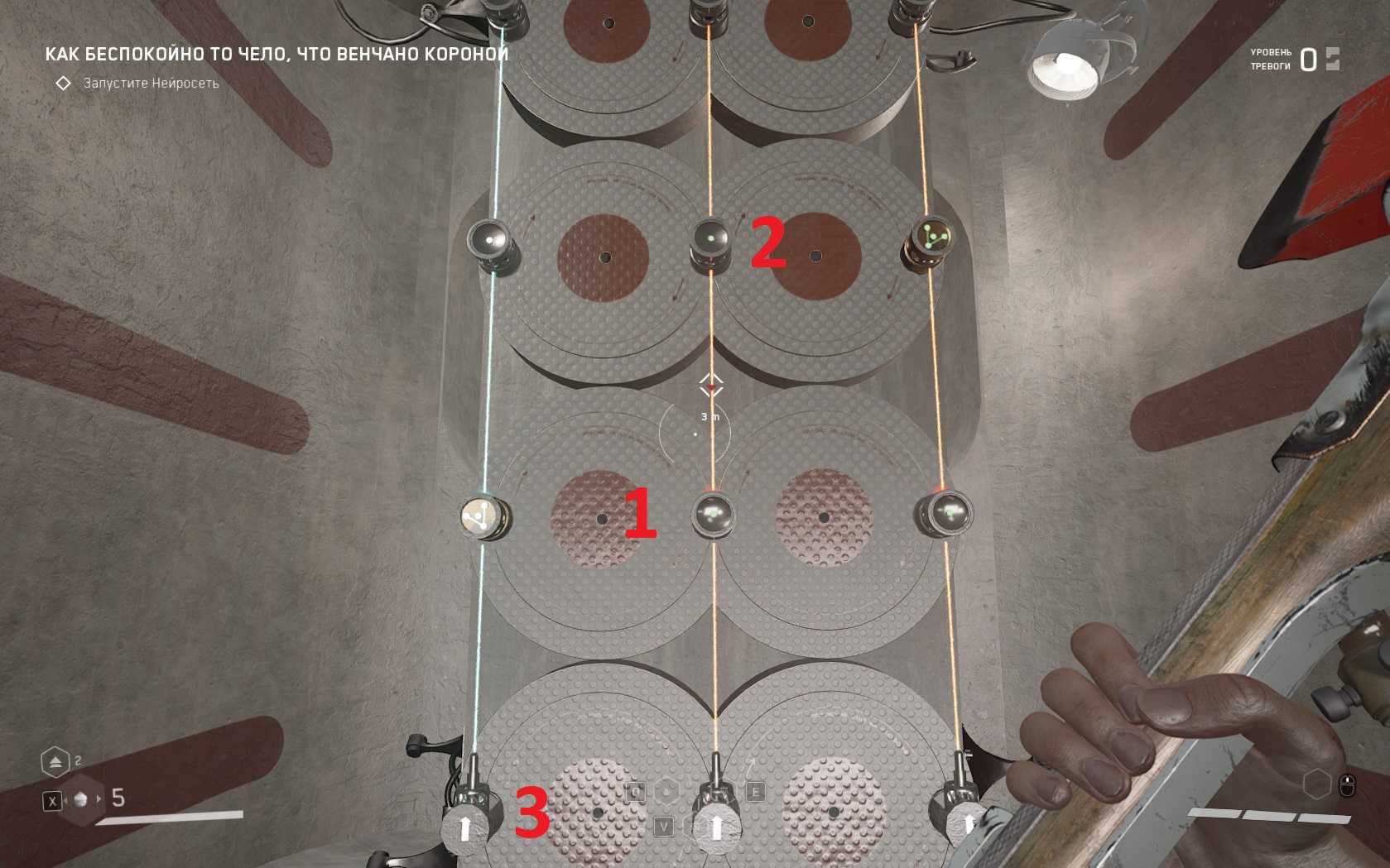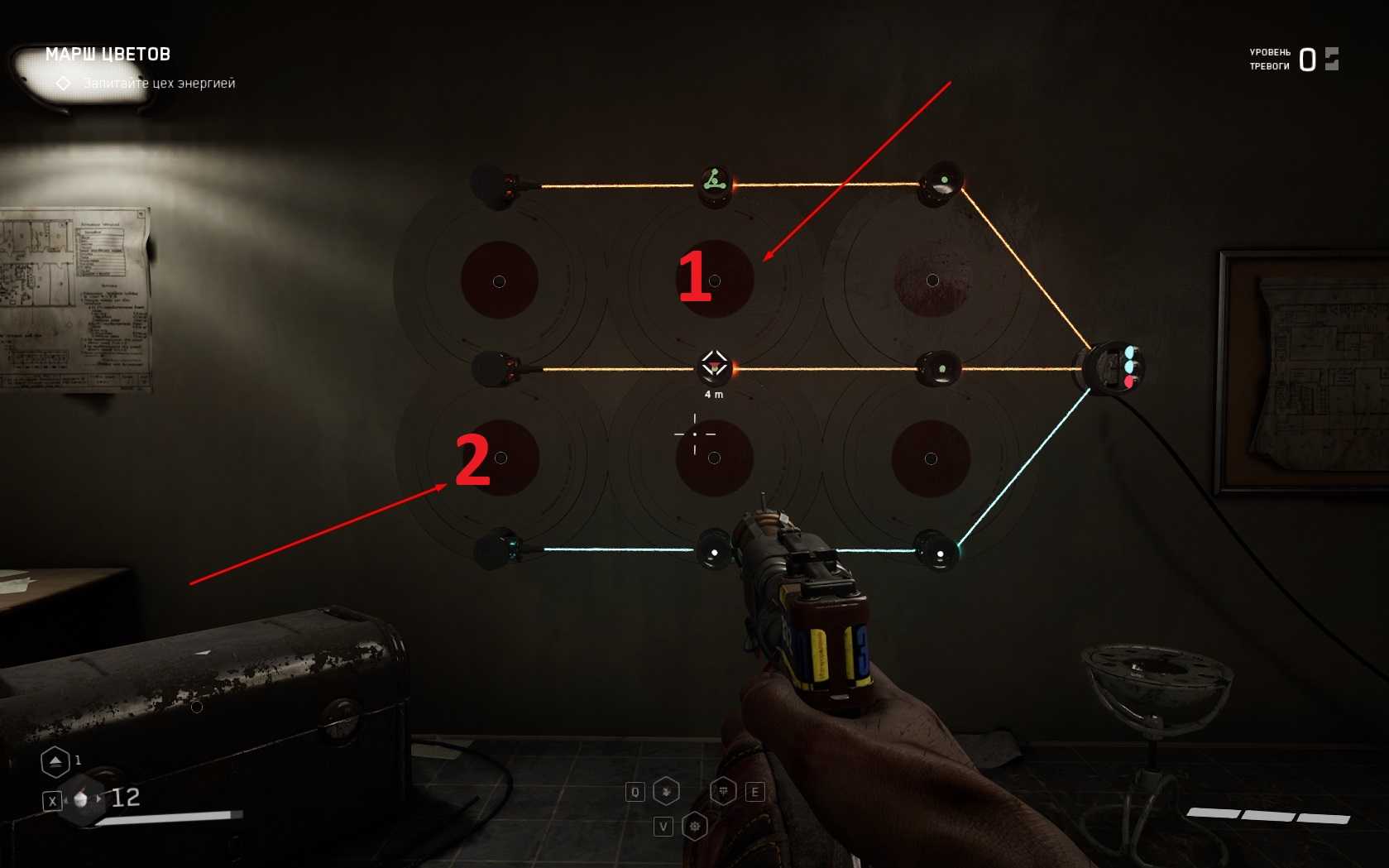 Возвратитесь к замку и выберите лампочки, показанные на скриншоте выше. Подробнее о прохождении данного задания и поисках кода мы рассказали в отдельной статье.