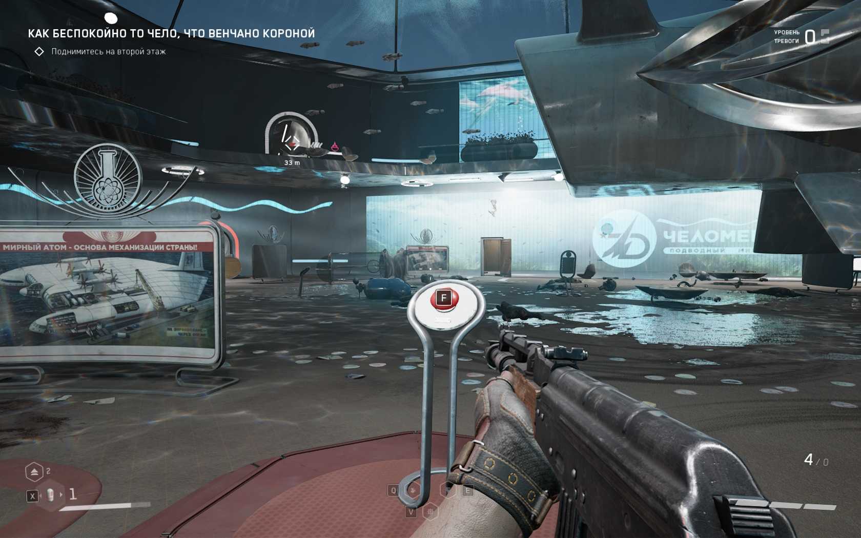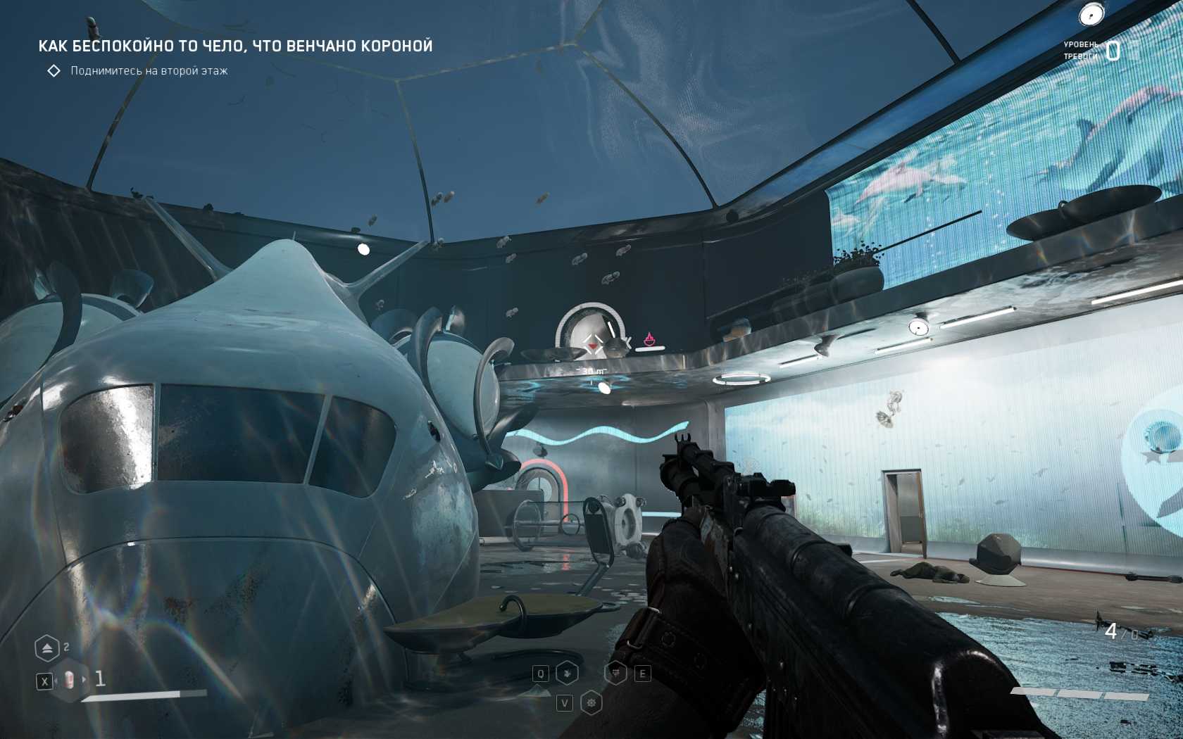 Теперь вернитесь к лифту возле бассейна. Спуститесь вниз, нажмите кнопку под «Белугой», после чего она поедет влево и упадет. Используйте ее, чтобы забраться на второй уровень зала (пройдите по ней, как по мостику, запрыгивать надо со стороны носа).