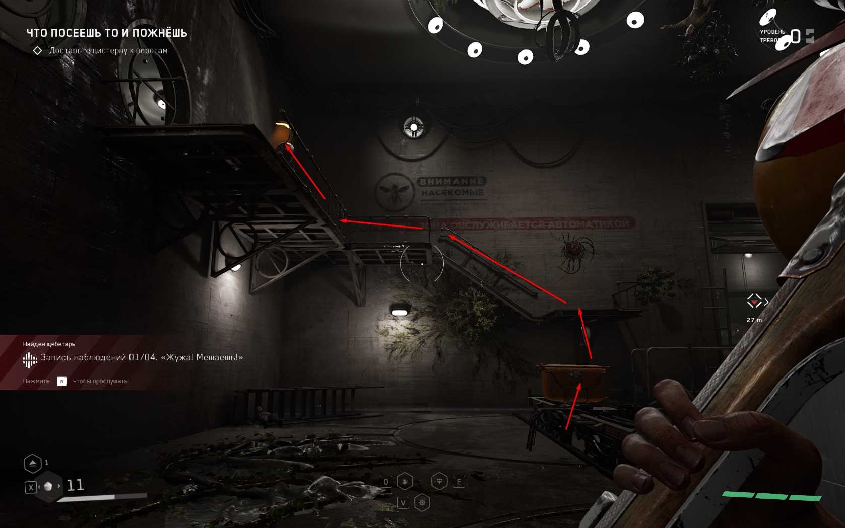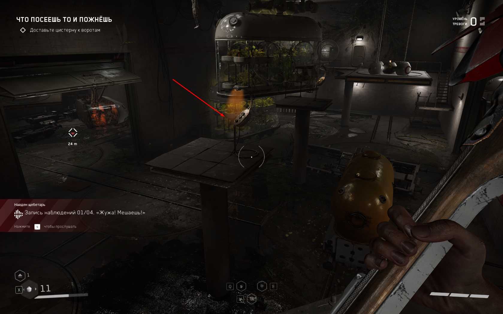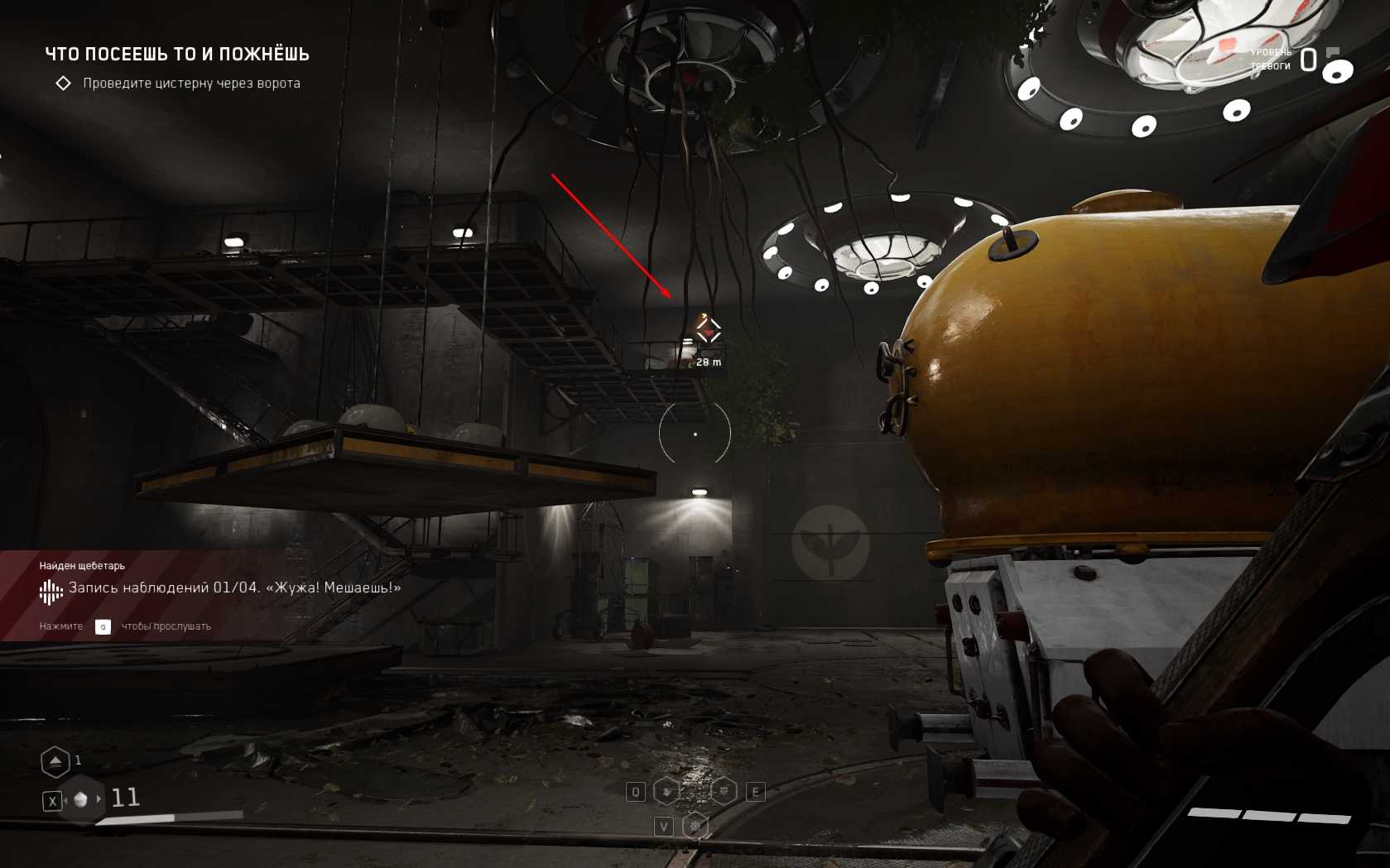 Следуйте за квестовым маркером, попутно убивая мутантов и Побеги, пока не доберетесь до помещения с желтой цистерной. Поднимитесь по лестнице возле цистерны. Там будет безопасная комната, а под потолком – первый пульт управления тягачом.