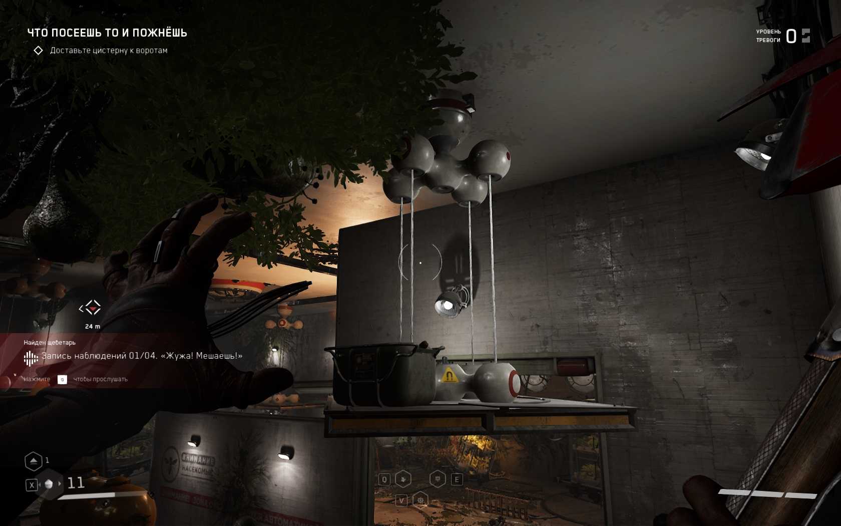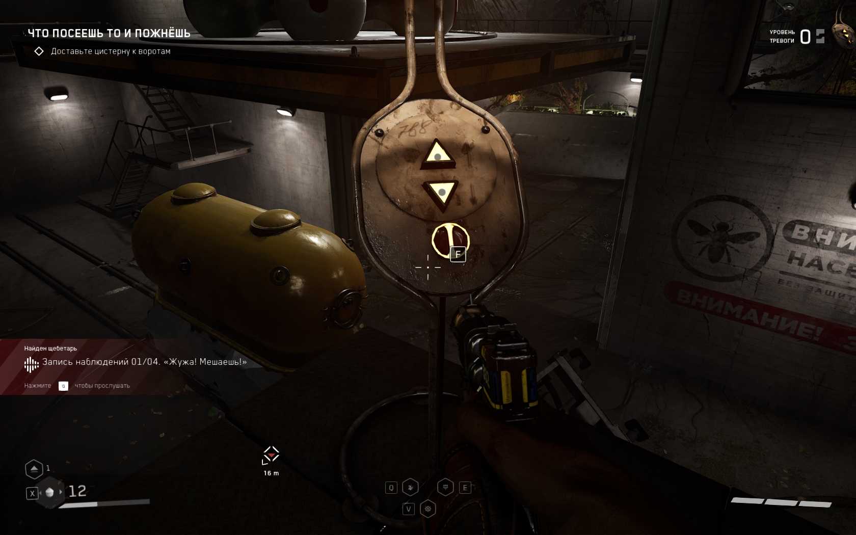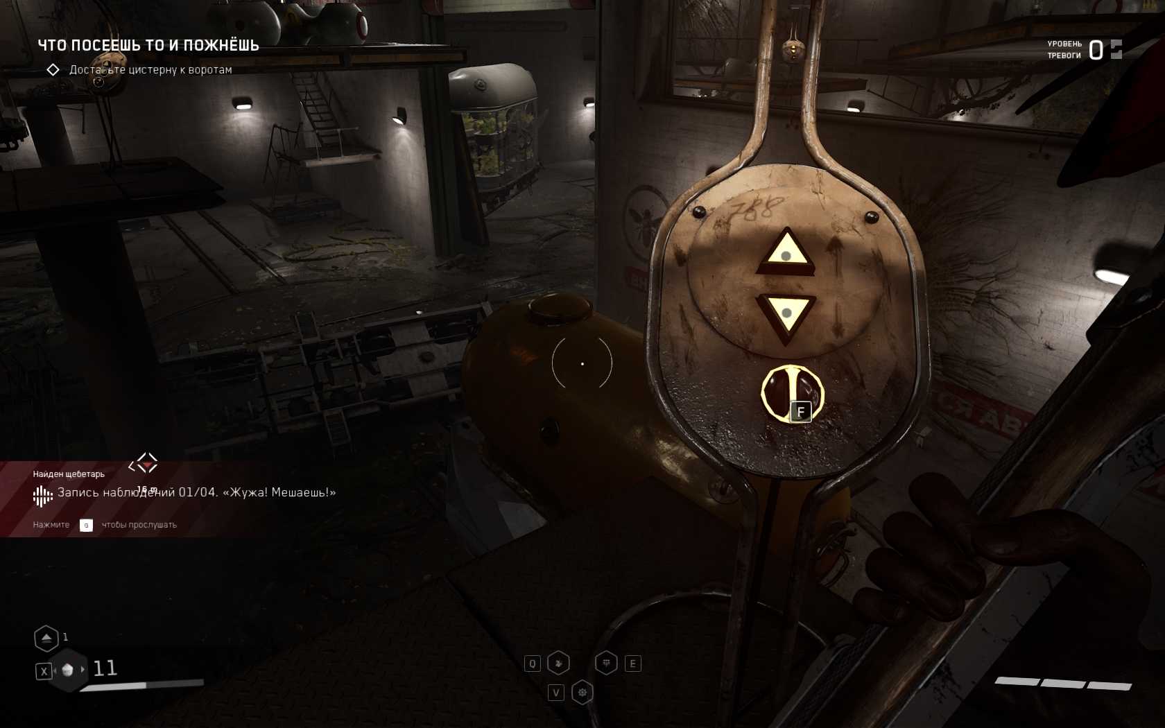 Следуйте за квестовым маркером, попутно убивая мутантов и Побеги, пока не доберетесь до помещения с желтой цистерной. Поднимитесь по лестнице возле цистерны. Там будет безопасная комната, а под потолком – первый пульт управления тягачом.