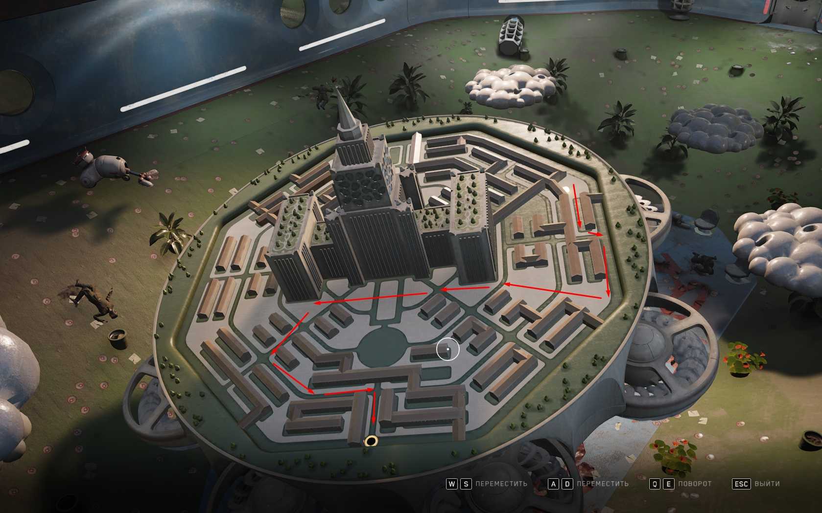 Взаимодействуйте с устройством на краю балкона, чтобы управлять механическим островом. Поворот острова – клавиши QE, наклон – WASD. Ваша задача: довести шарик до лунки. На изображениях ниже показан примерный маршрут движения шарика.