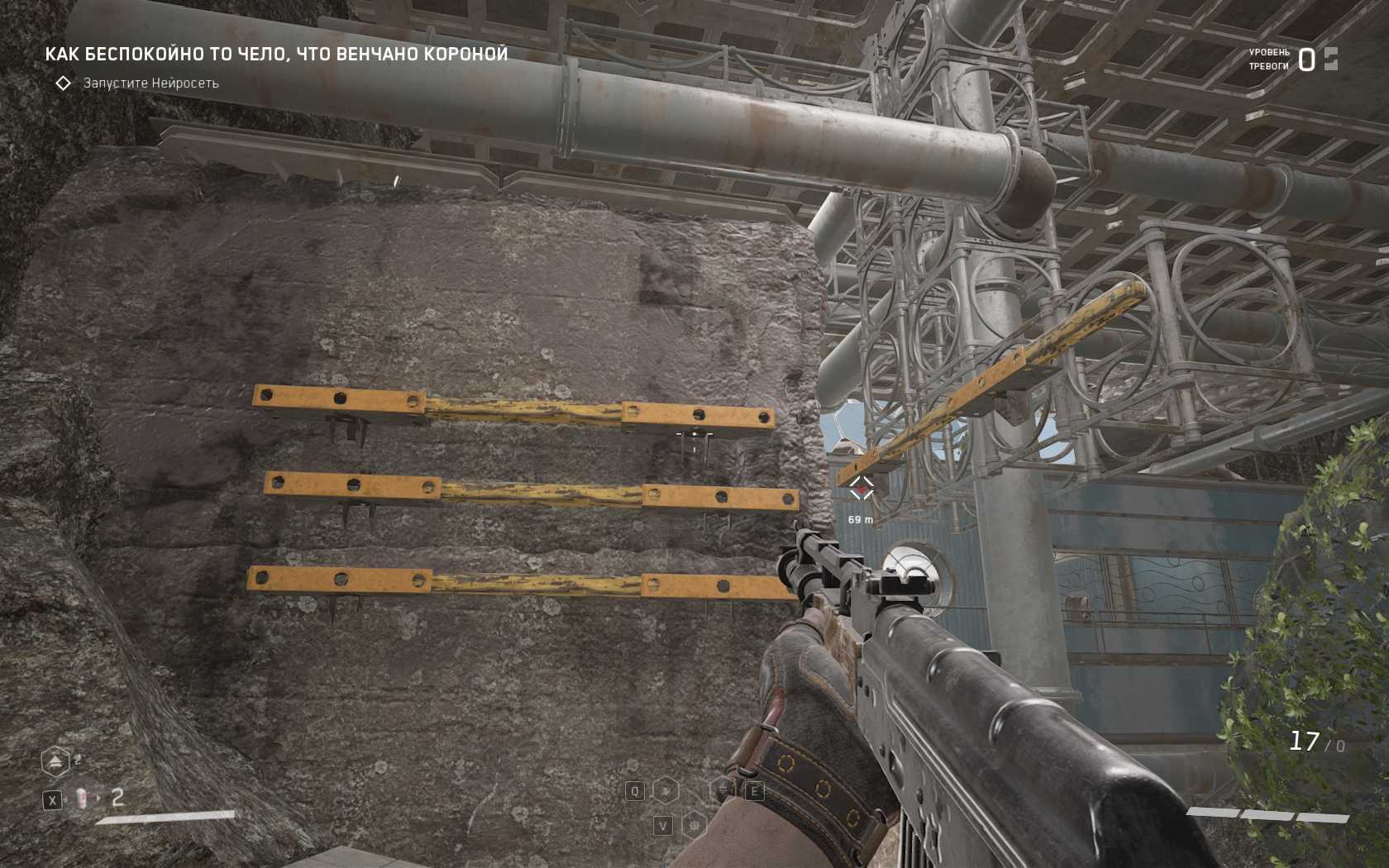 Выйдя из лифта, расправьтесь с несколькими «Сипухами», и залезьте в полимер, с помощью которого можно добраться до выступа на скале вверху. Далее используйте перекладины, чтобы попасть на мостик с ходящим по нему Лаборантом.