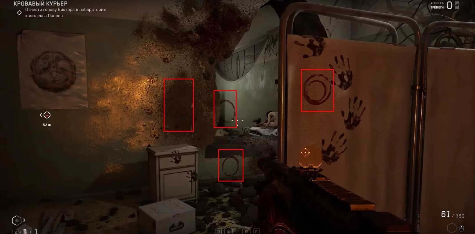 Попав в комплекс «Павлов», вы начнете задание «Кровавый курьер». Следуя за маркером, вы спуститесь на второй нижний уровень, где обнаружите дверь, закрытую на графический замок. Чтобы найти ключ от нее, спуститесь еще ниже и пройдите в пылающую комнату. Здесь на ширме кровью будет указана комбинация.