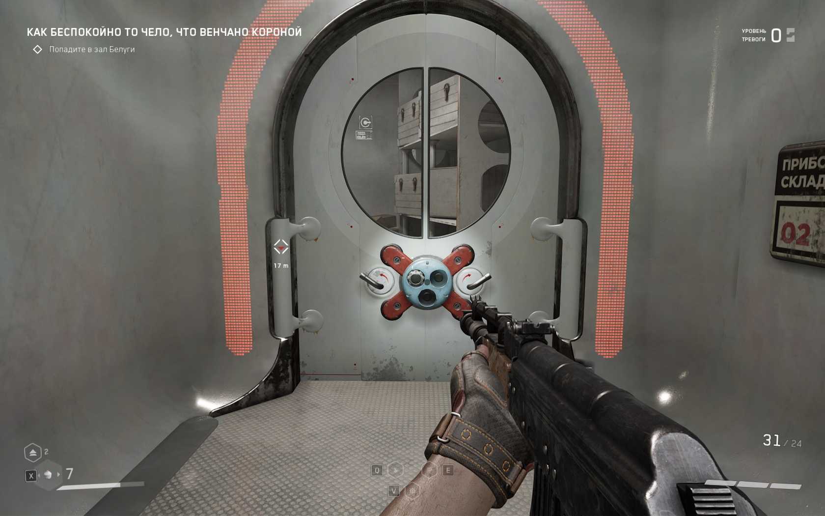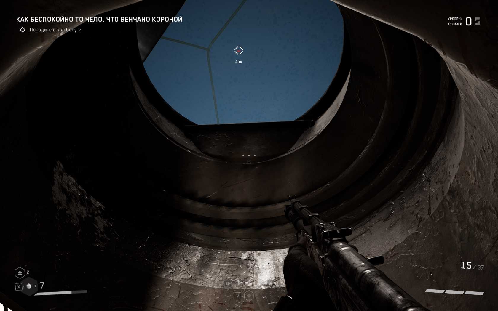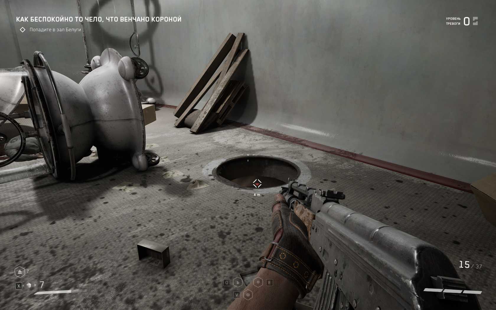 Идите по коридору до замка, взломайте его и спуститесь в вентиляцию через открытый люк в полу. Двигаясь по вентиляционному туннелю, следите за квестовым маркером. Он укажет вам на люк, через который можно выбраться в помещение с подвешенным под потолком аппаратом «Белуга».