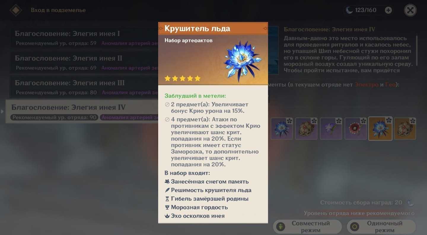- Бонус комплекта из четырех предметов: атаки по противникам с эффектом Крио увеличивают шанс критического попадания на 20%. Если у противника статус Заморозка — дополнительно увеличивает шанс критического попадания на 20%.