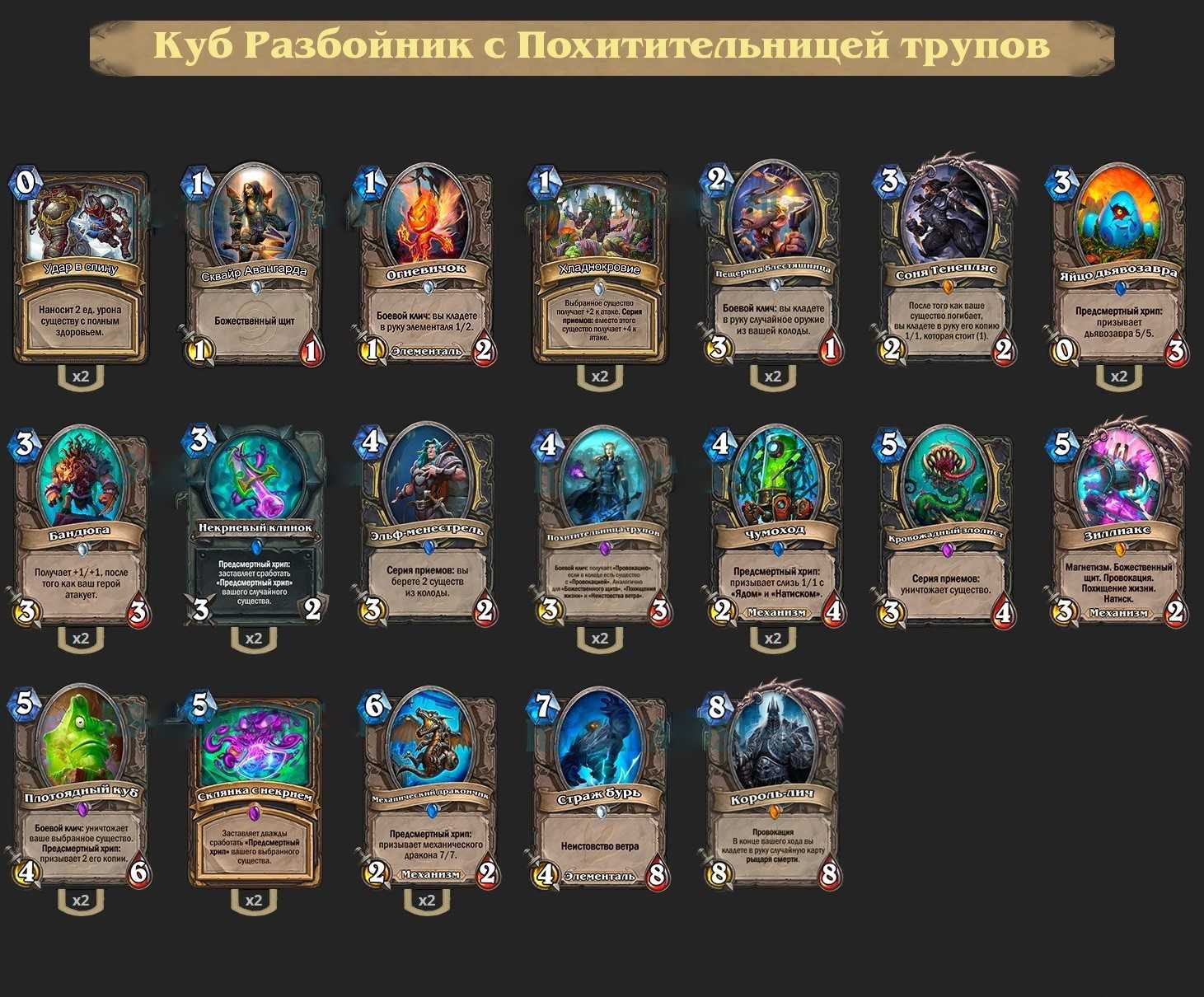 Как было сказано ранее, колода Куб Разбойника потеряла одни из самых актуальных карт для конкурентного ведения борьбы со своими оппонентами. Своё название герой сегодняшнего материала получил от карты “Плотоядный куб”, которая отыгрывала одну из ключевых ролей в построении сборки. В настоящее время Куб переведен в вольный формат, а Рога на хрипах практически пропала из поля зрения в рейтинговом формате игры. Однако, Проект Бумный день все еще жив, и данный архетип имеет своих поклонников, поэтому давайте рассмотрим сборку подробнее.