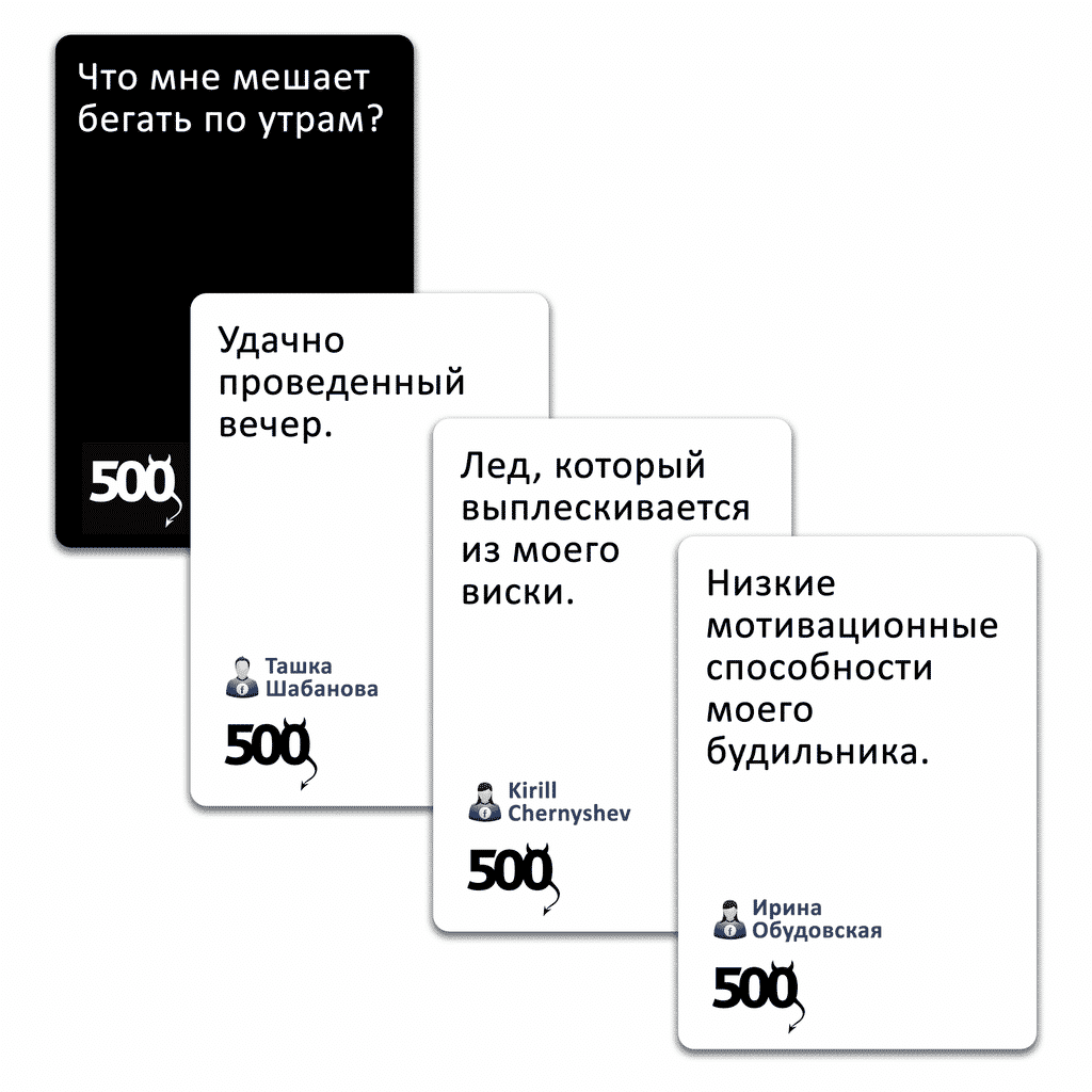 500 злобных карт — настольная игра, в которой одновременно могут участвовать от трех до двадцати игроков, поэтому набор подойдет для огромных компаний. Даже без дополнений вы сможете разыграть множество конов, за которые не выпадет ни одной повторяющейся комбинации. Хотя набор и рассчитан на большие компании, играть в него в семейном кругу все же не стоит: карточки в комплекте часто содержат нецензурные и откровенно пошлые слова и фразы.