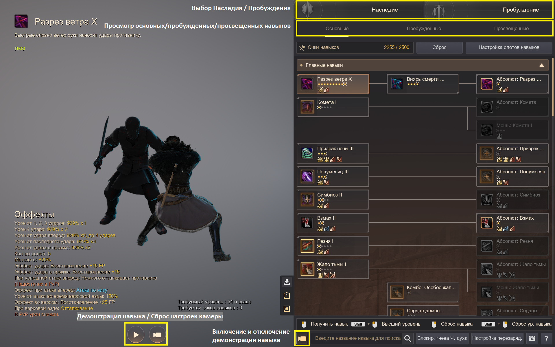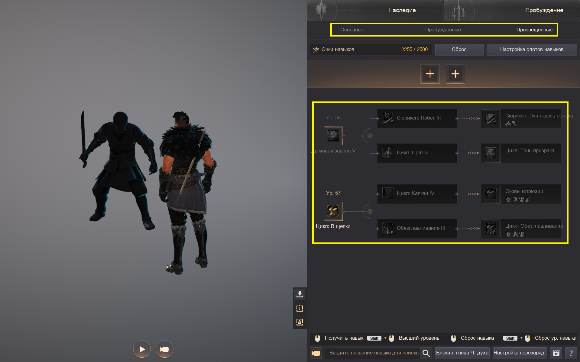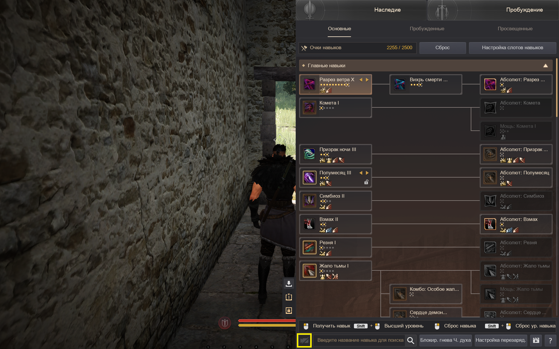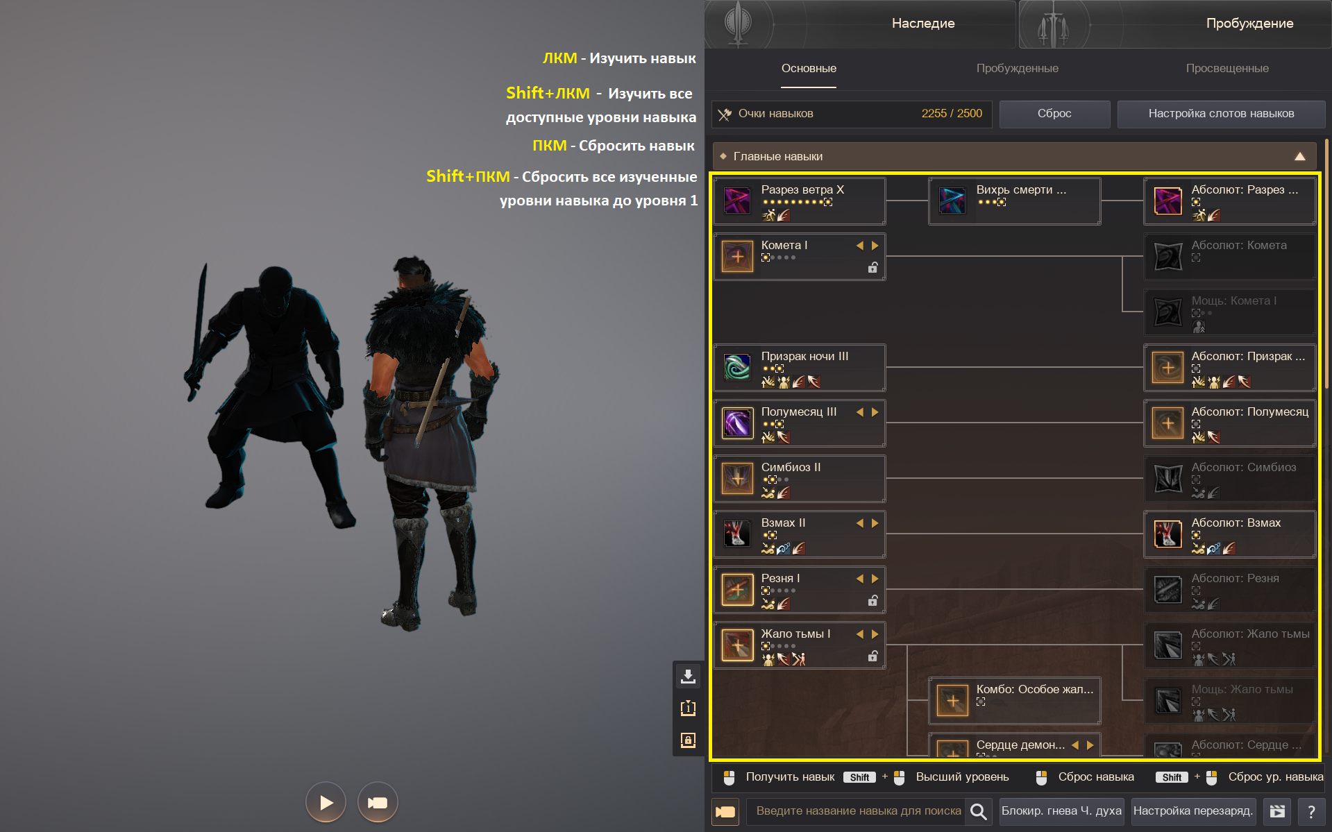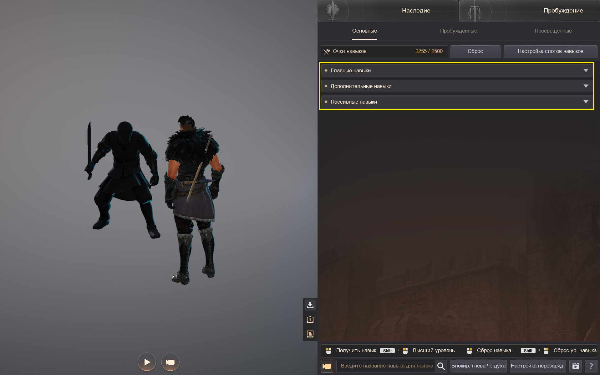 В правом верхнем меню вы можете просмотреть окно с навыками Наследия или Пробуждения после завершения соответствующих заданий.