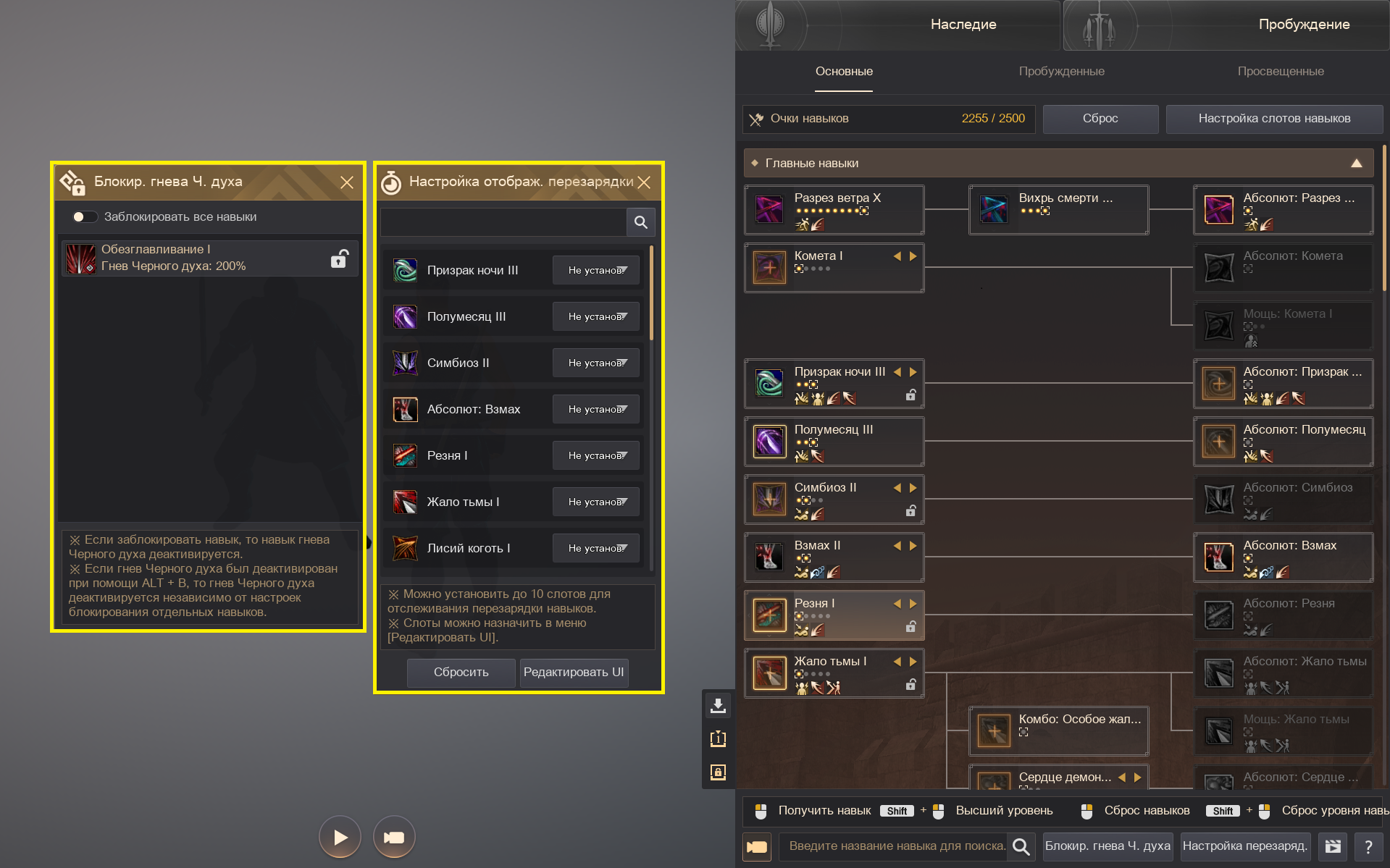 — Используя кнопки в правой нижней части окна навыков, можно активировать блокировку гнева Черного духа, а также настроить отображение перезарядки навыков.