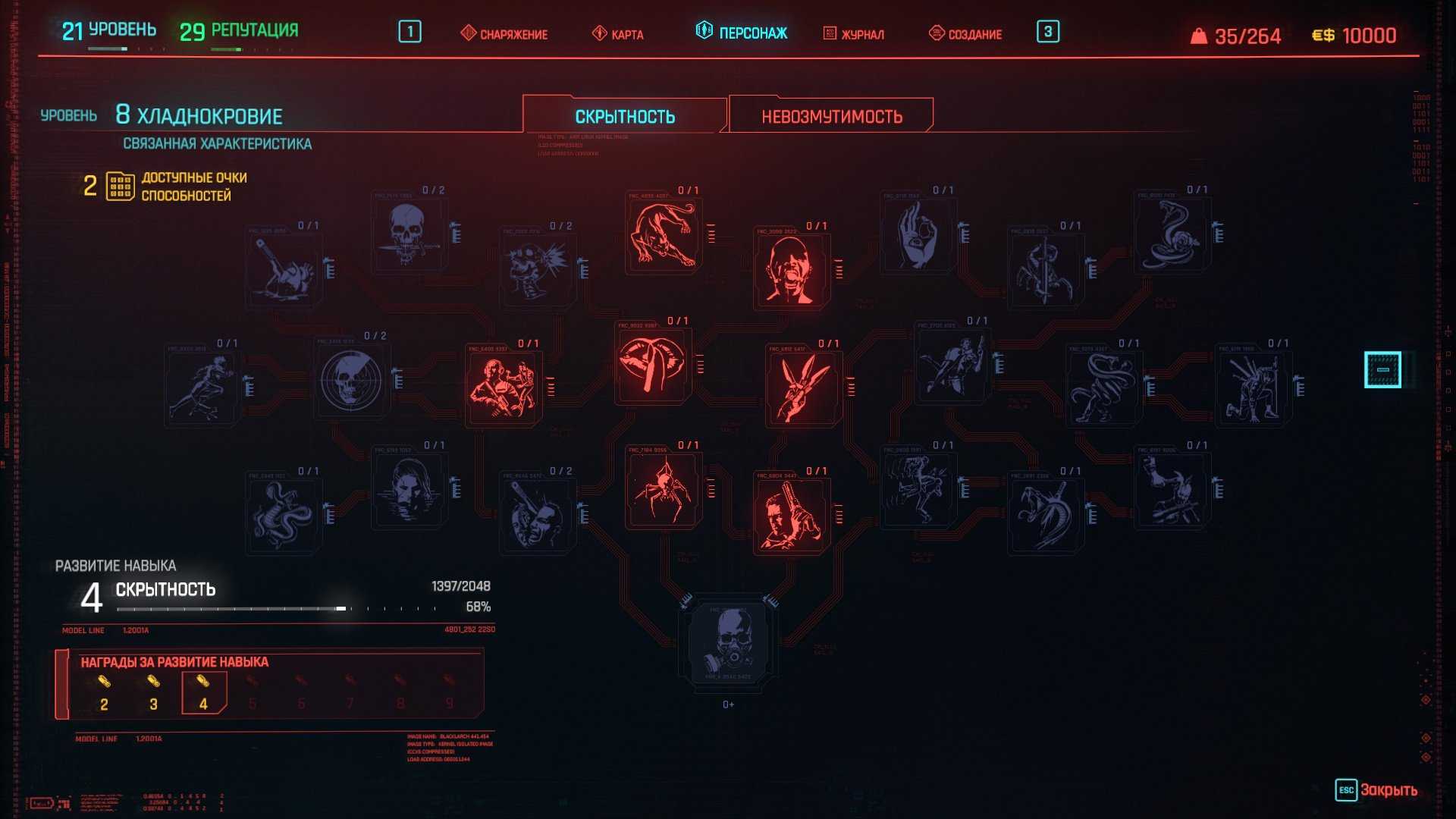 Развитие навыков — это ваша возможность повысить уровень вашего V в соответствии с вашим собственным стилем игры. Взлом систем, бег, прыжки, создание снаряжения, убийство врагов клинками, использование тяжелого оружия — за все это начисляются очки в соответствующей ветке навыков.