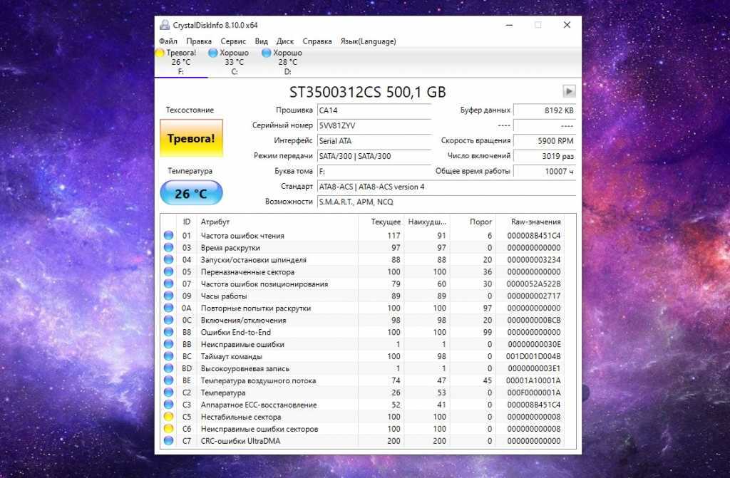 Если в индикаторе состояния написано «Хорошо», значит диск полностью исправен. Если индикатор желтого цвета и написано «Тревога!», значит на диске есть ошибки или неисправности – например, «битые сектора». Они будут указаны ниже. Обычно работать с таким диском все еще можно, однако во время игры могут случаться жесткие зависания на несколько секунд, а порой и вовсе вылеты с непонятными ошибками.