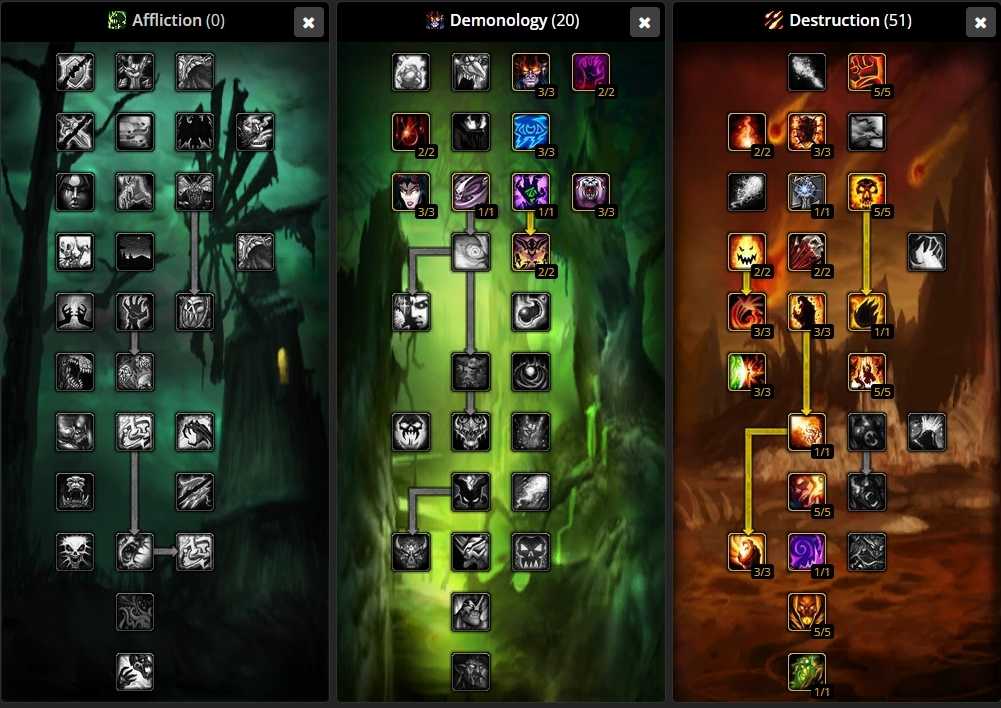 В следующих статьях я подробнее раскажу обо всём остальном — какую ветку качать лучше Чернокнижнику, как раскидывать таланты в PvE и PvP, а так же расскажу подробнее о прислужниках, и напишу маленький гайд по квестам на них.