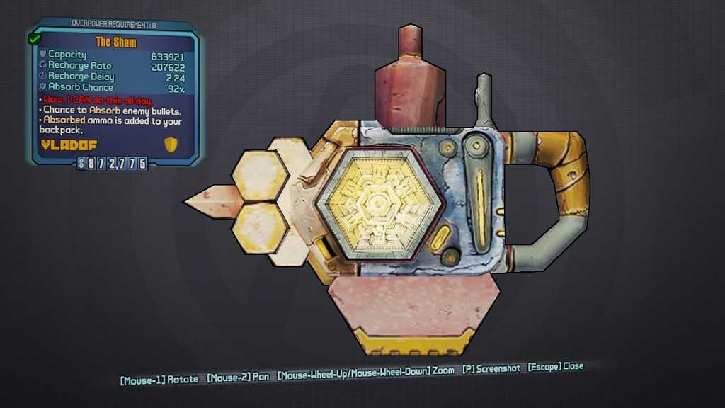 Думаю этот щит тоже достоин тут сидеть. Ребят советую всем выфармить ибо он полезен если вы на игле мели и не можете позволить себе патроны. Падает с сундуков и жестяного жида . И да расскажу как его применяют большинство игроков. Берете низко-уровневый Ствол Логана который падает с Лысого (ну или Вильгельма) и стреляете себе под ноги. Так регенятся ракеты что полезно поскольку максимум который вы можете нести это 33 ракеты.