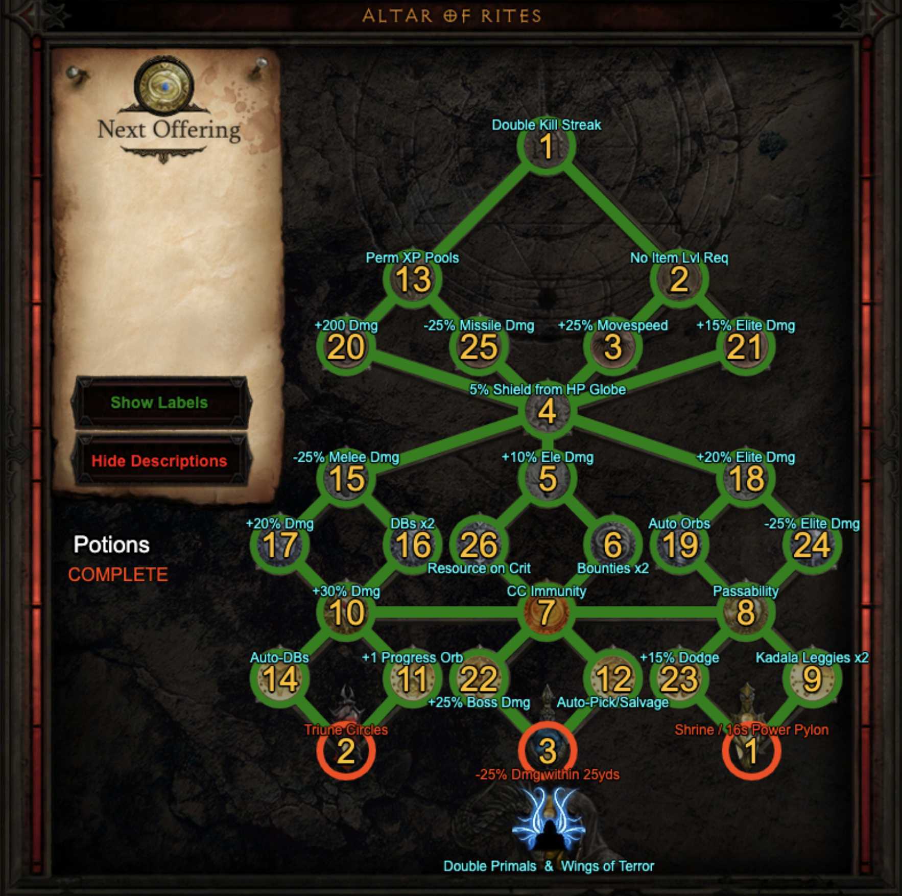 В 28-м сезоне тема Алтаря обрядов — новая мощная система прогресса для всей учетной записи и для конкретного сезона, которая обеспечивает потрясающие наступательные и защитные эффекты для каждого сезонного персонажа. Практически для всех сборок и игроков всех уровней мастерства — от обычного до продвинутого — мы рекомендуем продвигаться по дереву алтаря, используя путь, описанный ниже. Предлагаемый путь сначала ориентирован на максимальное качество жизни, затем на усиление урона, а затем на зачистку дерева с помощью защитных и вспомогательных узлов.