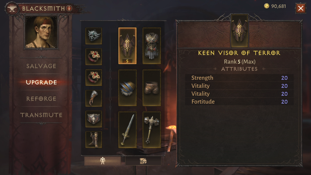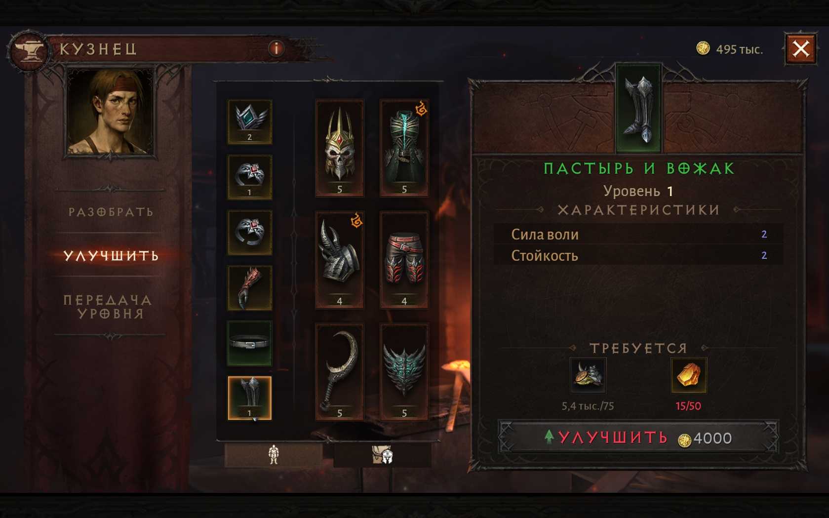 Сетовые зеленые элементы экипировки для вторичных слотов улучшаются у кузнеца по той же схеме, что и обычные легендарные аксессуары и броня. Чтобы повысить ранг предмета, вам необходимо иметь достаточное количество таких материалов: