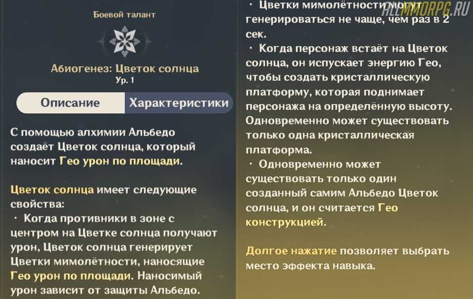 «Абиогенез: Цветок солнца» – способность, позволяющая герою наносить неплохой АОЕ-урон. При использовании навыка Альбедо размещает на земле Цветок солнца. Какими свойствами обладает Цветок солнца, вы можете увидеть на скриншоте ниже.