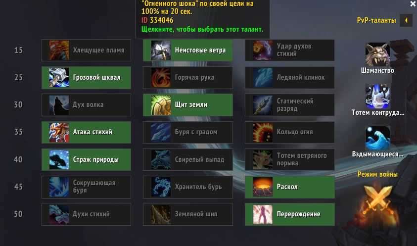 В первую очередь нам нужно скрафтить легендарку с эффектом Ветра Рока. Данный эффект можно полутать в подземелье «Шпили Перерождения» с последнего босса. Шанс дропа не зависит от сложности, в которой вы проходите подземелье. На данный момент эффект падает довольно редко, лично у меня больше 50 попыток, а ветра рока будто ветром сдуло. Как только мы получим данный эффект, можно спокойно собирать ваншот билд. Для этого нам нужно выбрать следующие таланты – Неистовые ветра, Грозовой шквал, Щит земли, Атака стихий, Страж природы, Раскол и Перерождение. Как это все работает? Сейчас расскажу. Легендарный эффект даст вам сто процентную вероятность прока виндфури на 12 секунд при установке Тотема неистовства ветра. За счет этого, все ваши автоатаки с каждым ударом будут бить еще раз и с большей силой за счет таланта Неистовые ветра. Приятным бонусом станет следующий набор PvP талантов. Шаманство – даст вам возможность использовать БЛ на арене каждую минуту, но прибавка к скорости составит 20%. Тотем контрудара или Тотем заземления – первый тотем даст вам возможность отражать обычный урон противников обратно, а второй забирает на себя вредоносные заклинания при установке. Берите по ситуации. Талант вздымающиеся волны позволит вам исцеляться почти на фулл хп при использовании исцеляющего всплеска.