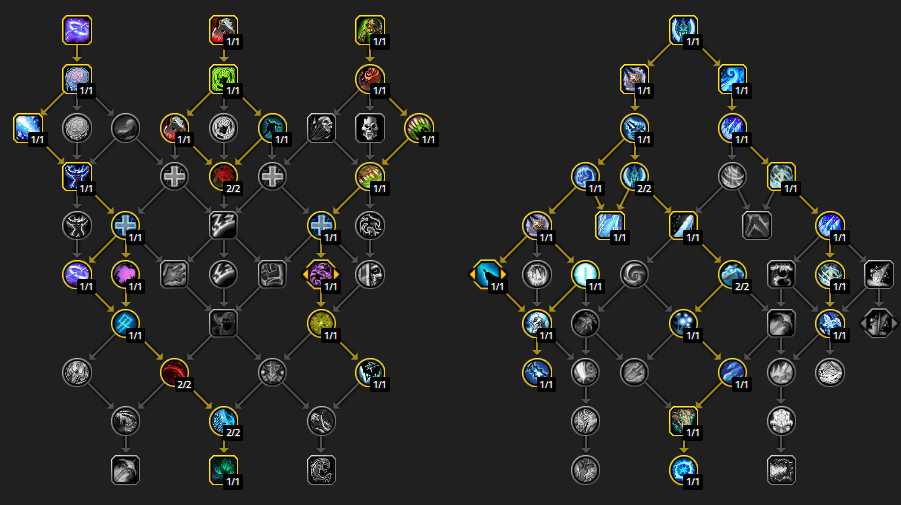 Ниже представлен рекомендуемый путь распределения накопленной энергии артефакта, рекомендации составлены на основе таблиц SimulationCraft. Целью данного действия является совершенствование оружия персонажа с каждым пройденным этапом для достижения наибольшего DPS, поэтому каждый шаг очень важен, ведь исправление неверного хода будет занимать значительное время. Каждый этап отмечен своим цветом, как видно ниже на схеме. В некоторых случаях требуется добавление характеристик из разных областей, в эти моменты все равно в каком порядке их добавлять – они равноценны, главное сделать это до того, как будешь осуществлять следующий шаг.