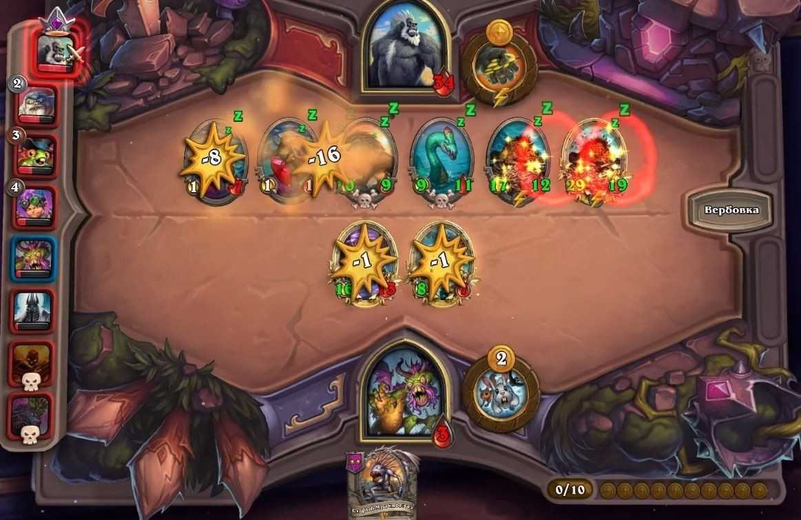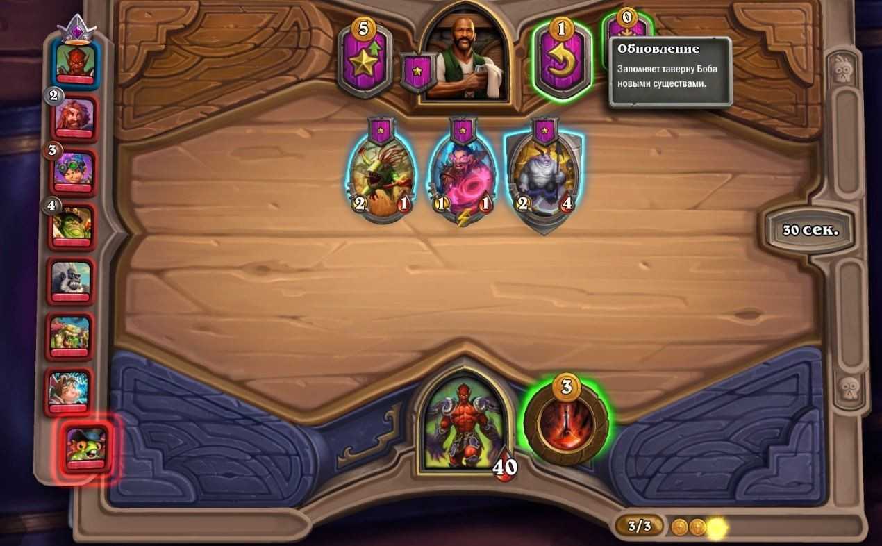 Во время фазы вербовки вы находитесь в таверне Боба. У него на столе есть выбор из нескольких существ. В отличии от классического Хартстоуна, вы можете менять расстановку существ: на ней завязаны многие стратегии, поэтому не забывайте об этом. Боб предлагает вам четыре действия на выбор: