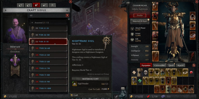 Затем вы сможете использовать эту золу для создания новых Печатей кошмара. Вы можете выбрать нужный уровень Печати перед крафтом, но подземелье и аффиксы будут определяться случайным образом. Это дает вам возможность исследовать высокоуровневые кошмарные подземелья, если ваш билд на это готов.