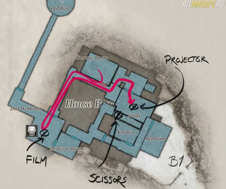 Сделав все правильно, воспроизведите фильм. После этого за стеллажом откроется проход. Войдите внутрь и поверните в проходе направо. Возьмите у куклы на полке ножницы.