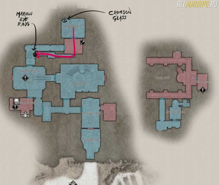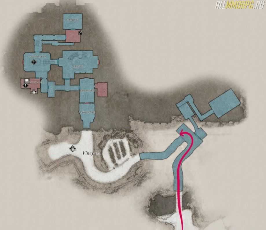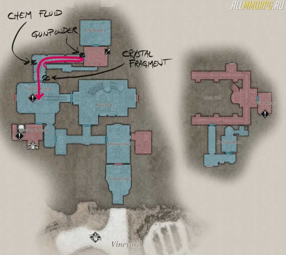 Наверху зайдите в винотеку (на двери изображен виноград). Заберите реагент и прочтите записки о виноделии. В нише справа есть статуя. При взаимодействии с ней вы увидите, что нужен ключ. У нас его пока нет.
