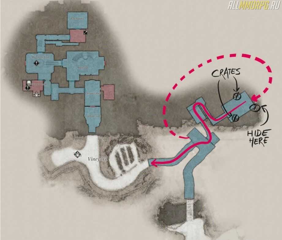 Большинство дверей в начале пути закрыты. К ним в дальнейшем нужно искать ключи. Коридор будет вести в просторный зал. Идите туда и ждите начала ролика. Вас поймает хозяйка замка со своими дочерями. Оказавшись в покоях вампирши, вам стоит осмотреться. Откройте отмычкой все ящики и проверьте их на наличие пороха и сокровищ.