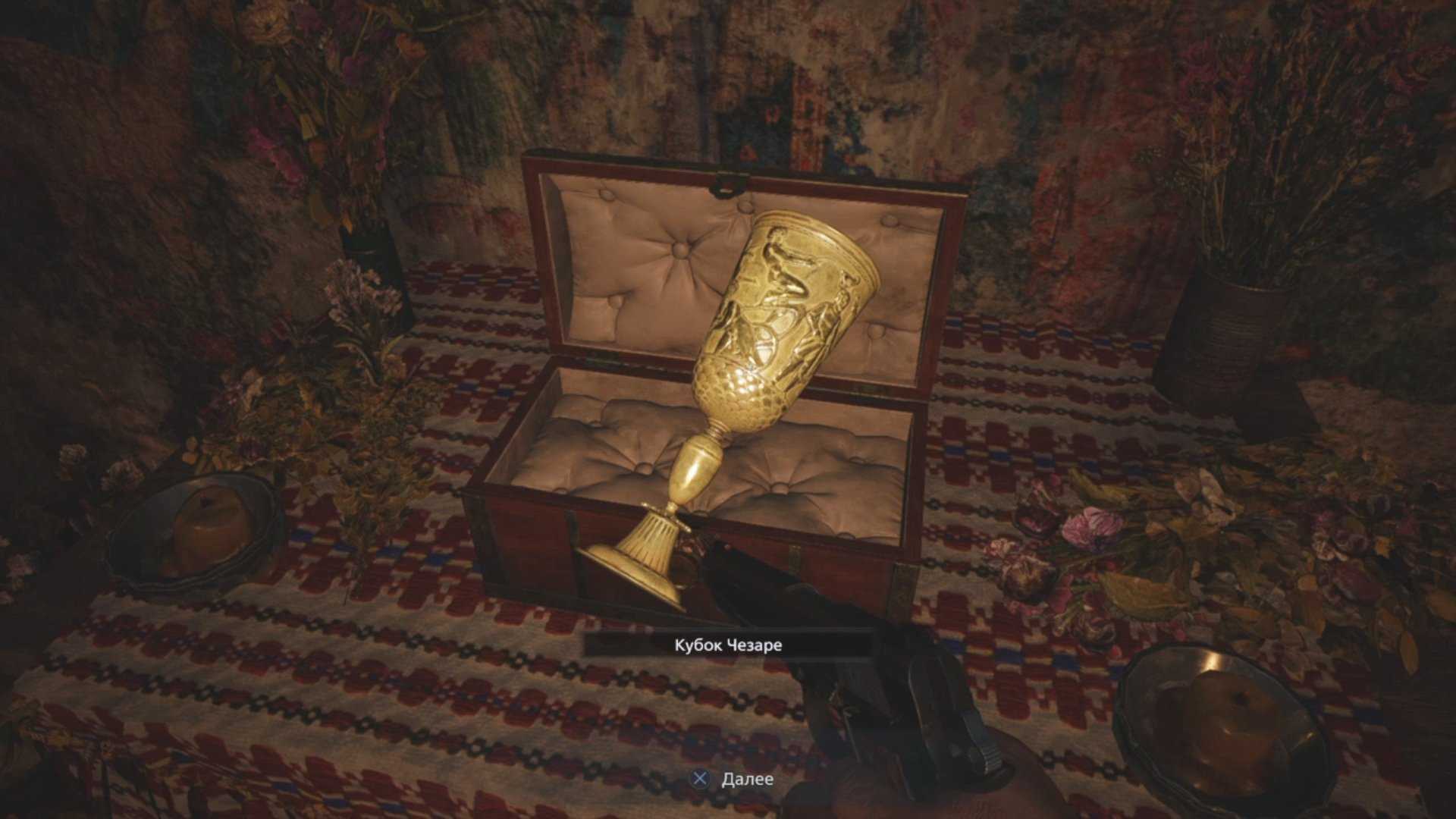 - Кубок Чезаре (19 000): Осмотрите ожерелье Луизы в инвентаре, найдите ключ от шкатулки. Примените ключ на шкатулке, что стоит на алтаре перед каменным мостом через реку.