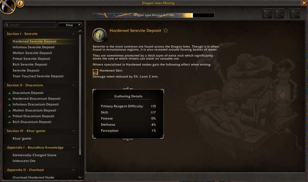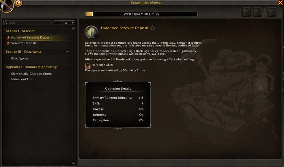 Как видите, журнал заполняется по мере того, как вы делаете открытия. У неопытного майнера запускаются только разделы для Серевита и Каз’горита, потому что этот игрок еще не нашел Дракониум. У опытного майнера список гораздо более полный, включая несколько различных подтипов каждой шахты. Цветные стрелки указывают, может ли майнер получить навыки от этого узла, используя обычные индикаторы Оранжевого, Желтого и Зеленого, без стрелок, если депозит тривиальный. В нем также перечислены другие навыки, которые шахтер мог получить благодаря специализациям, например, способность очищать руду, если шахтер специализировался на этих навыках.