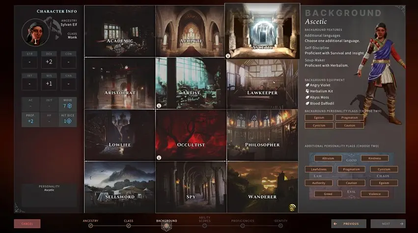 Предыстория , которая пришла с классом монаха, — это аскет . Другие хорошие варианты включают Законник , чтобы сделать вас более сильным атакующим в ближнем бою, и Академический , чтобы вы научились обращаться с четками Манакалона, которые полезны для зачарования предметов.
